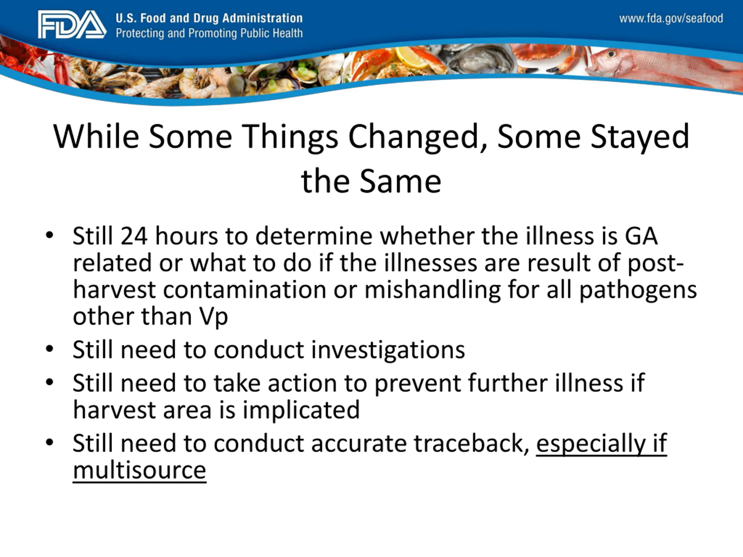 FDA_Swish_SeafoodXXX.png While Some Things Changed, Some Stayed the Same Still 24 hours to determine whether the illness is GA related or what to do if the illnesses are result of post- harvest contamination or mishandling for all pathogens other than Vp Still need to conduct investigations Still need to take action to prevent further illness if harvest area is implicated Still need to conduct accurate traceback, especially if multisource