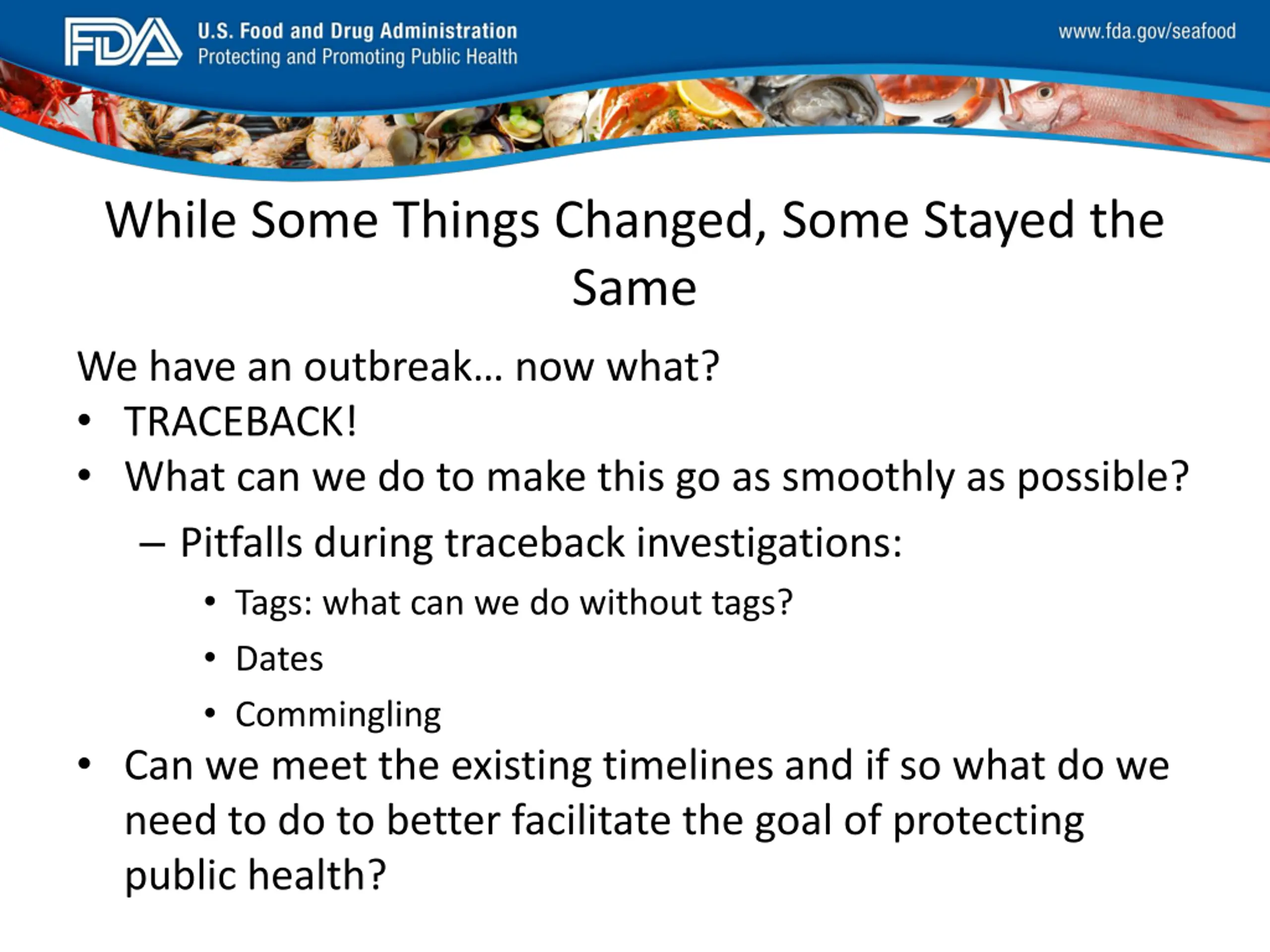 FDA_Swish_SeafoodXXX.png While Some Things Changed, Some Stayed the Same We have an outbreak now what? TRACEBACK! What can we do to make this go as smoothly as possible? Pitfalls during traceback investigations: Tags: what can we do without tags? Dates Commingling Can we meet the existing timelines and if so what do we need to do to better facilitate the goal of protecting public health?