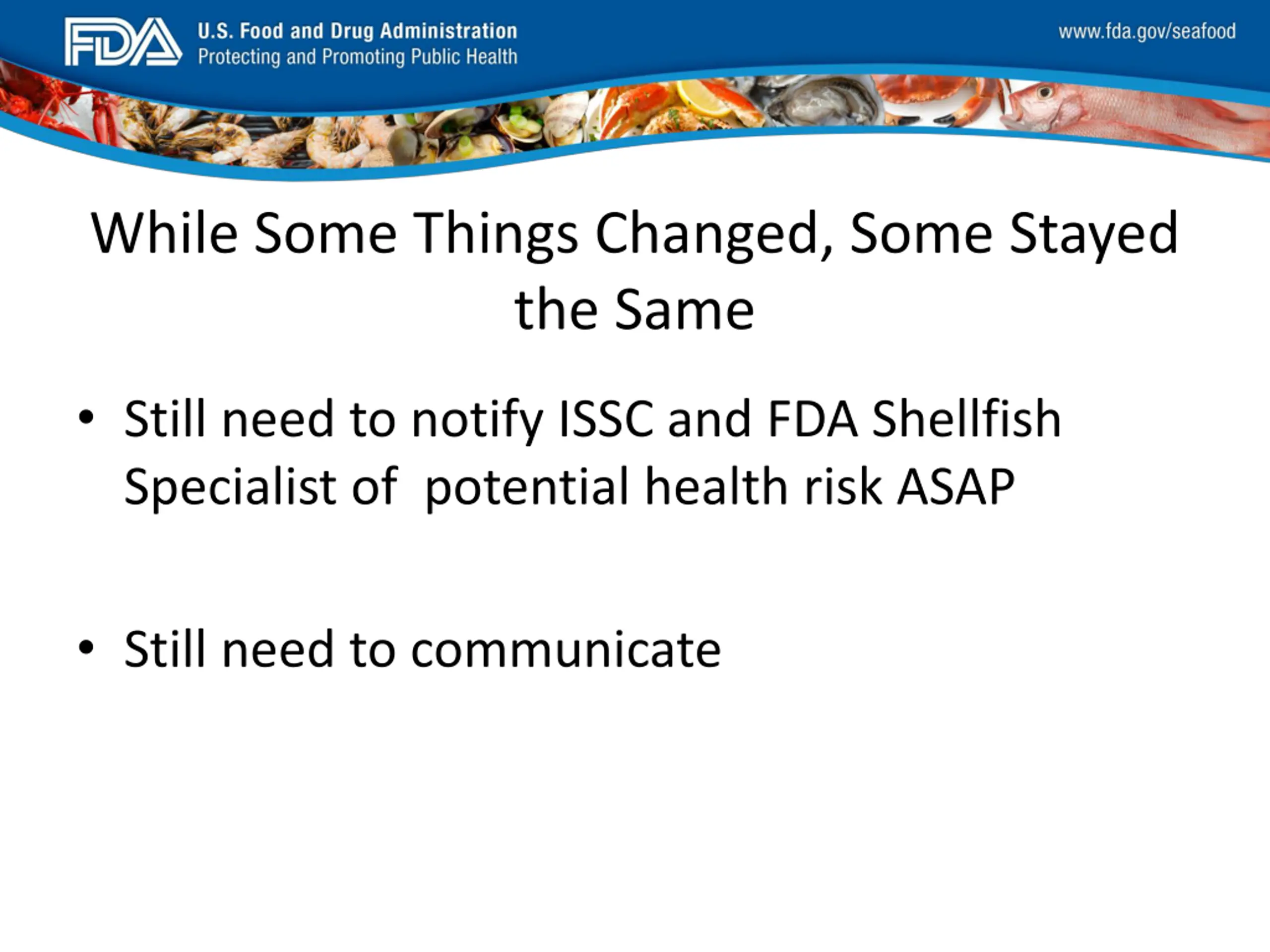 FDA_Swish_SeafoodXXX.png While Some Things Changed, Some Stayed the Same Still need to notify ISSC and FDA Shellfish Specialist of potential health risk ASAP Still need to communicate