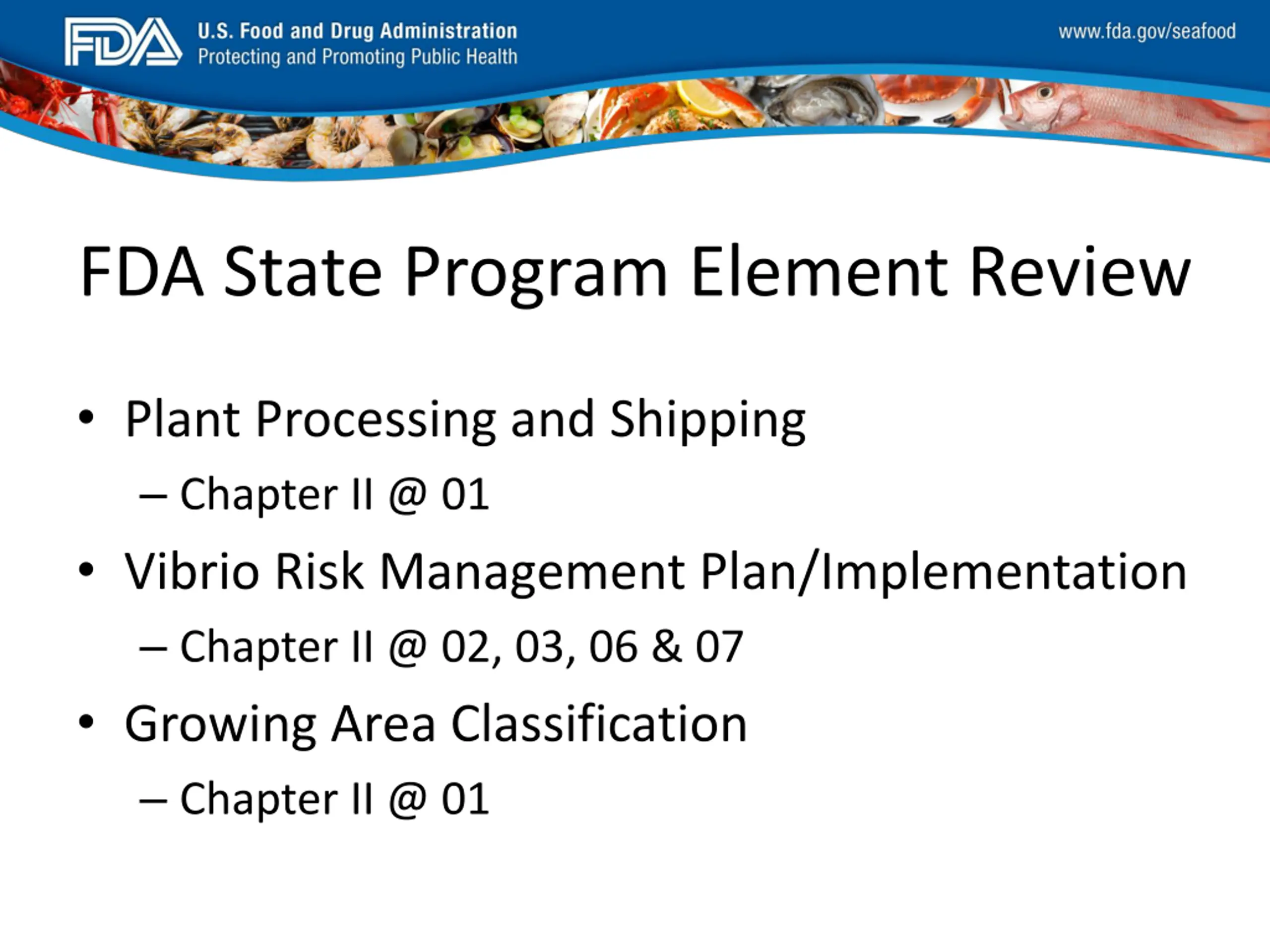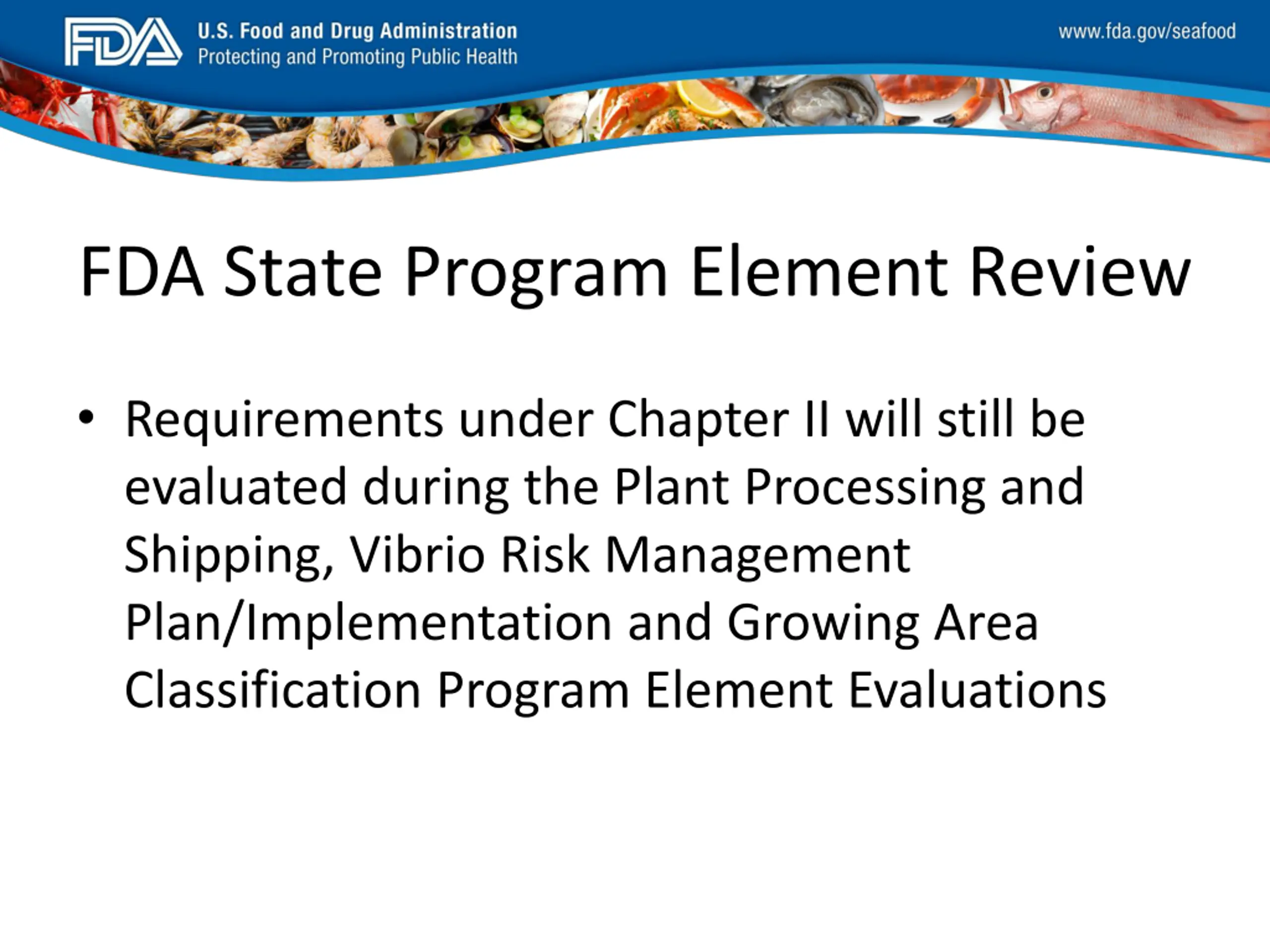 FDA_Swish_SeafoodXXX.png FDA State Program Element Review Requirements under Chapter II will still be evaluated during the Plant Processing and Shipping, Vibrio Risk Management Plan/Implementation and Growing Area Classification Program Element Evaluations