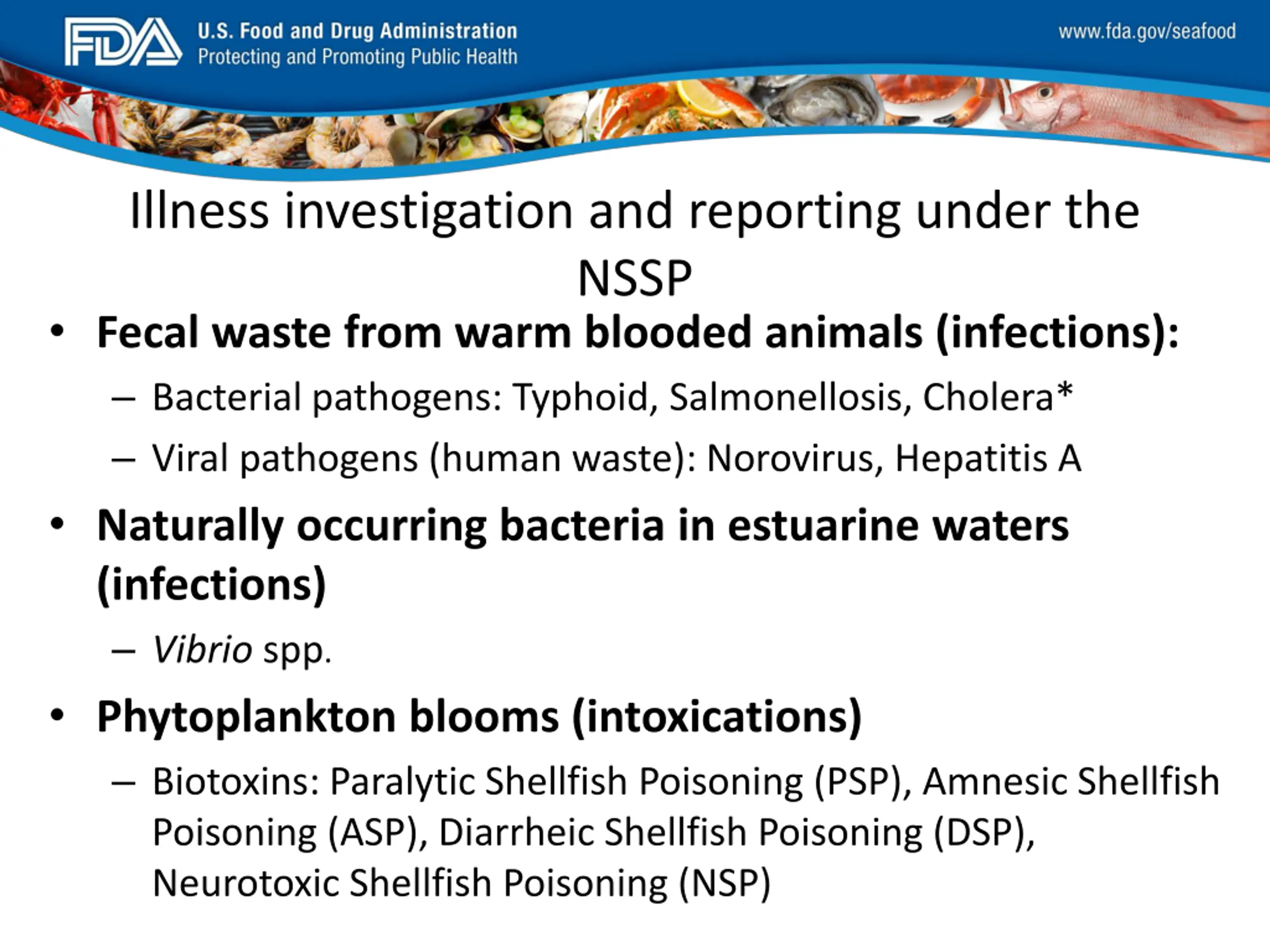 FDA_Swish_SeafoodXXX.png Illness investigation and reporting under the NSSP Fecal waste from warm blooded animals (infections): Bacterial pathogens: Typhoid, Salmonellosis, Cholera* Viral pathogens (human waste): Norovirus, Hepatitis A Naturally occurring bacteria in estuarine waters (infections) Vibrio spp. Phytoplankton blooms (intoxications) Biotoxins: Paralytic Shellfish Poisoning (PSP), Amnesic Shellfish Poisoning (ASP), Diarrheic Shellfish Poisoning (DSP), Neurotoxic Shellfish Poisoning (NSP)
