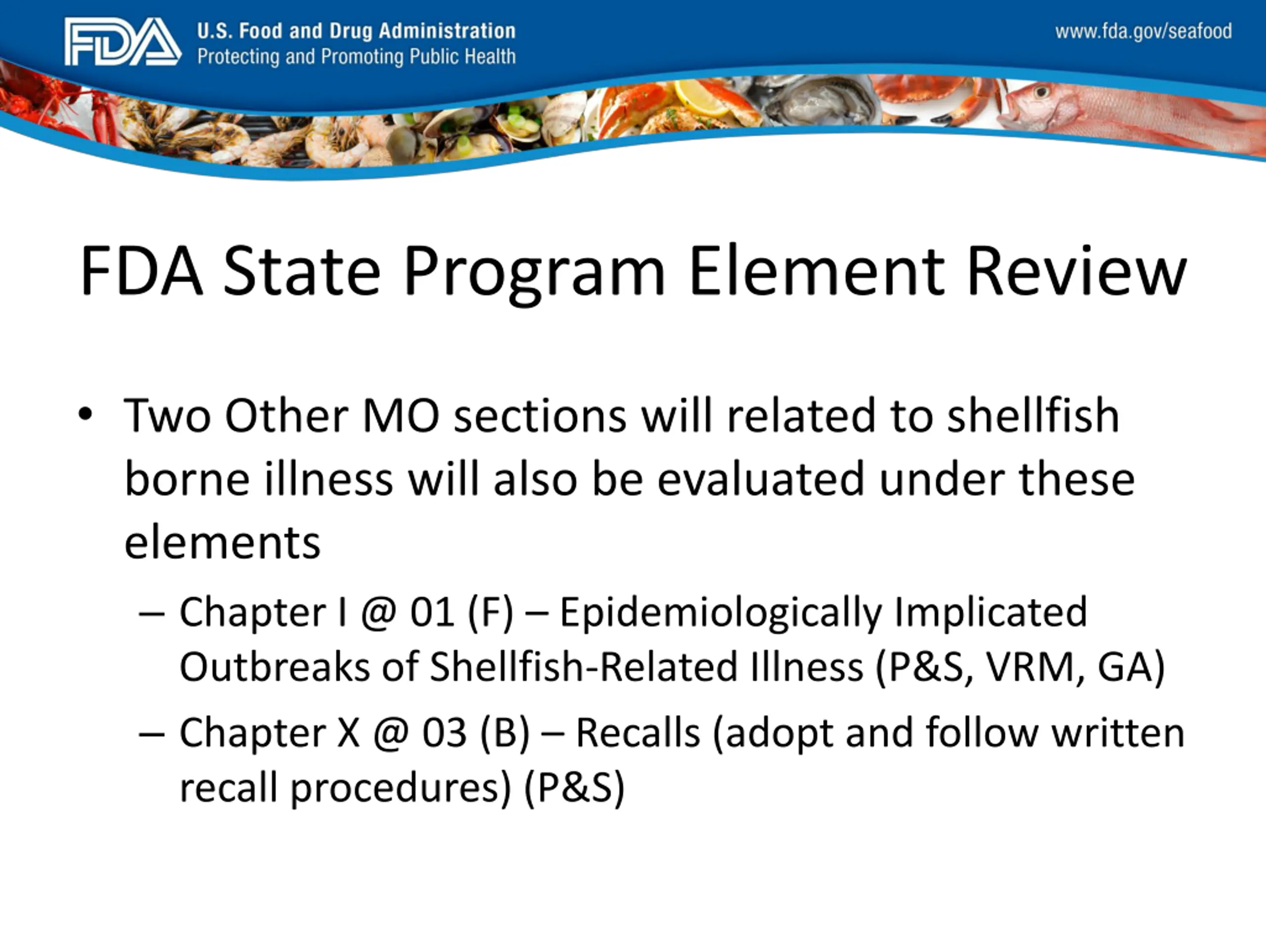 FDA_Swish_SeafoodXXX.png FDA State Program Element Review Two Other MO sections will related to shellfish borne illness will also be evaluated under these elements Chapter I @ 01 (F) Epidemiologically Implicated Outbreaks of Shellfish-Related Illness (P&S, VRM, GA) Chapter X @ 03 (B) Recalls (adopt and follow written recall procedures) (P&S)