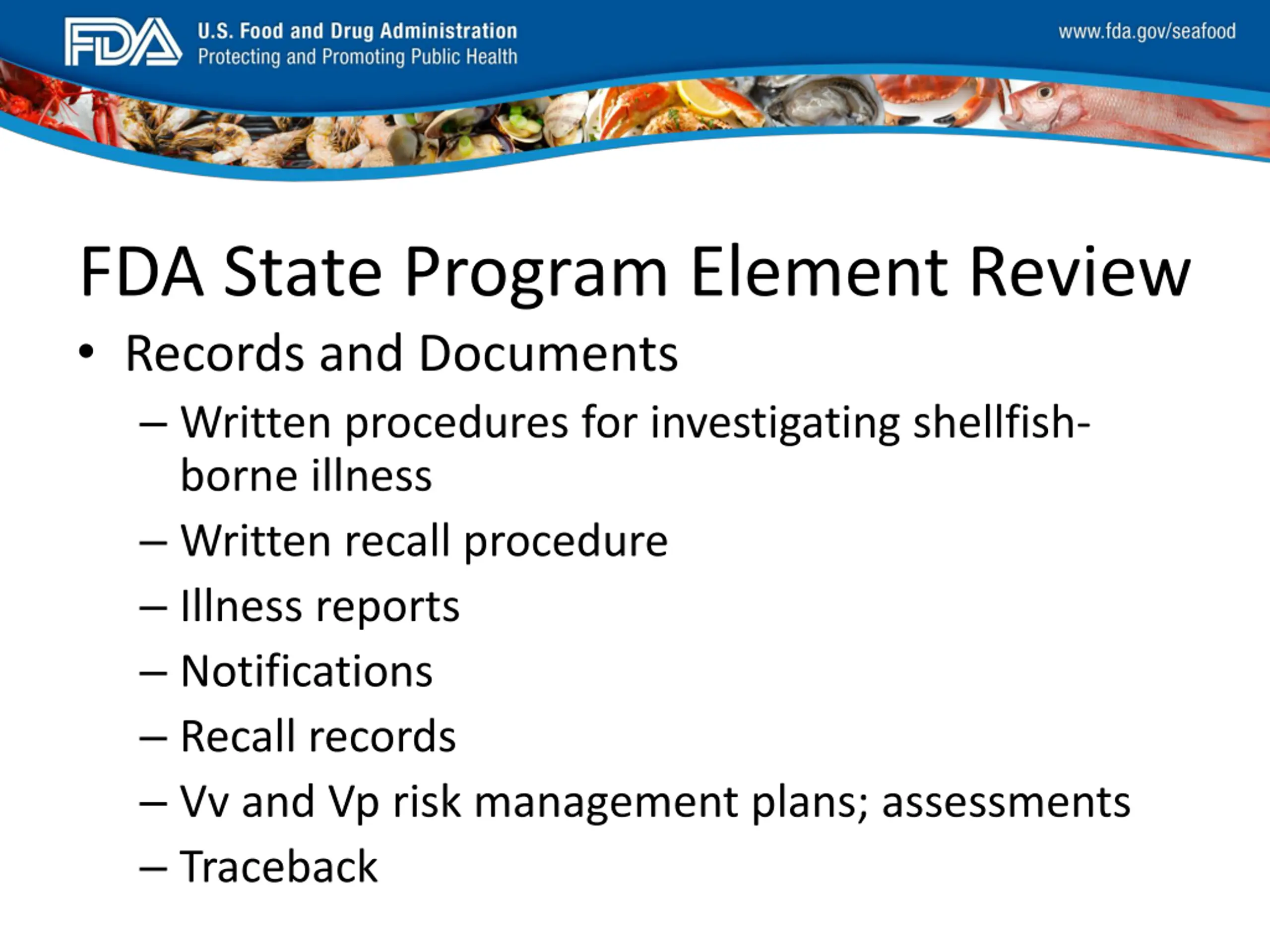 FDA_Swish_SeafoodXXX.png FDA State Program Element Review Records and Documents Written procedures for investigating shellfish- borne illness Written recall procedure Illness reports Notifications Recall records Vv and Vp risk management plans; assessments Traceback
