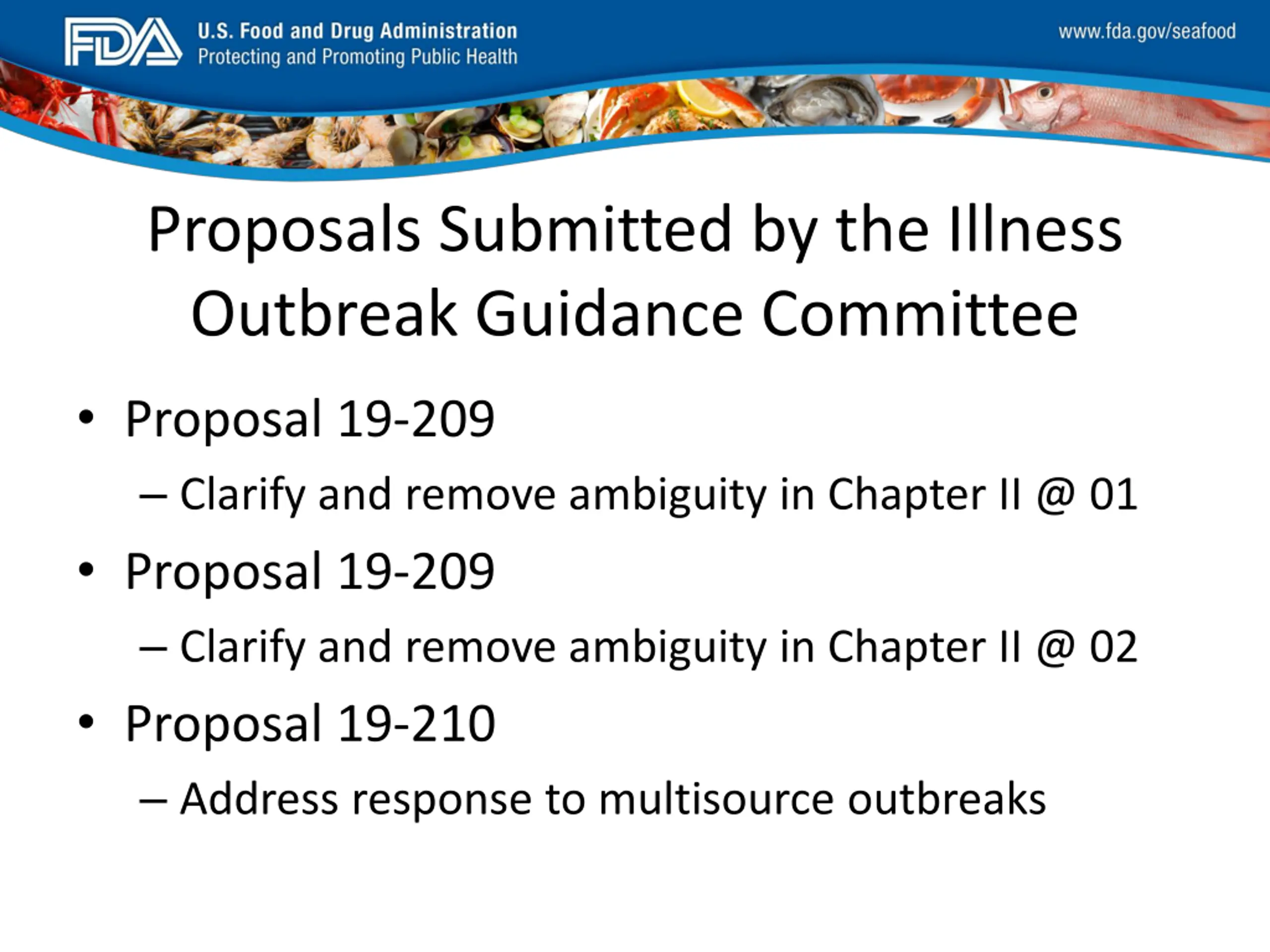 FDA_Swish_SeafoodXXX.png Proposals Submitted by the Illness Outbreak Guidance Committee Proposal 19-209 Clarify and remove ambiguity in Chapter II @ 01 Proposal 19-209 Clarify and remove ambiguity in Chapter II @ 02 Proposal 19-210 Address response to multisource outbreaks