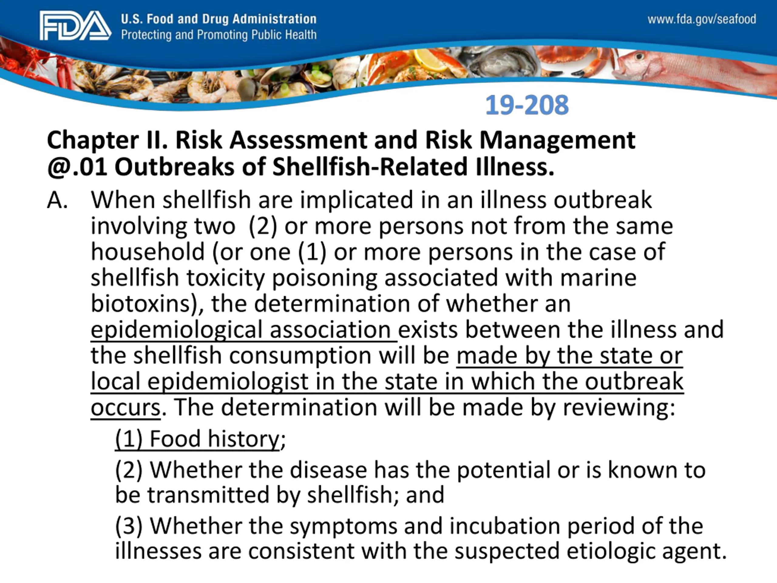 FDA_Swish_SeafoodXXX.png Chapter II. Risk Assessment and Risk Management @.01 Outbreaks of Shellfish-Related Illness. A. When shellfish are implicated in an illness outbreak involving two (2) or more persons not from the same household (or one (1) or more persons in the case of shellfish toxicity poisoning associated with marine biotoxins), the determination of whether an epidemiological association exists between the illness and the shellfish consumption will be made by the state or local epidemiologist in the state in which the outbreak occurs. The determination will be made by reviewing: (1) Food history; (2) Whether the disease has the potential or is known to be transmitted by shellfish; and (3) Whether the symptoms and incubation period of the illnesses are consistent with the suspected etiologic agent.