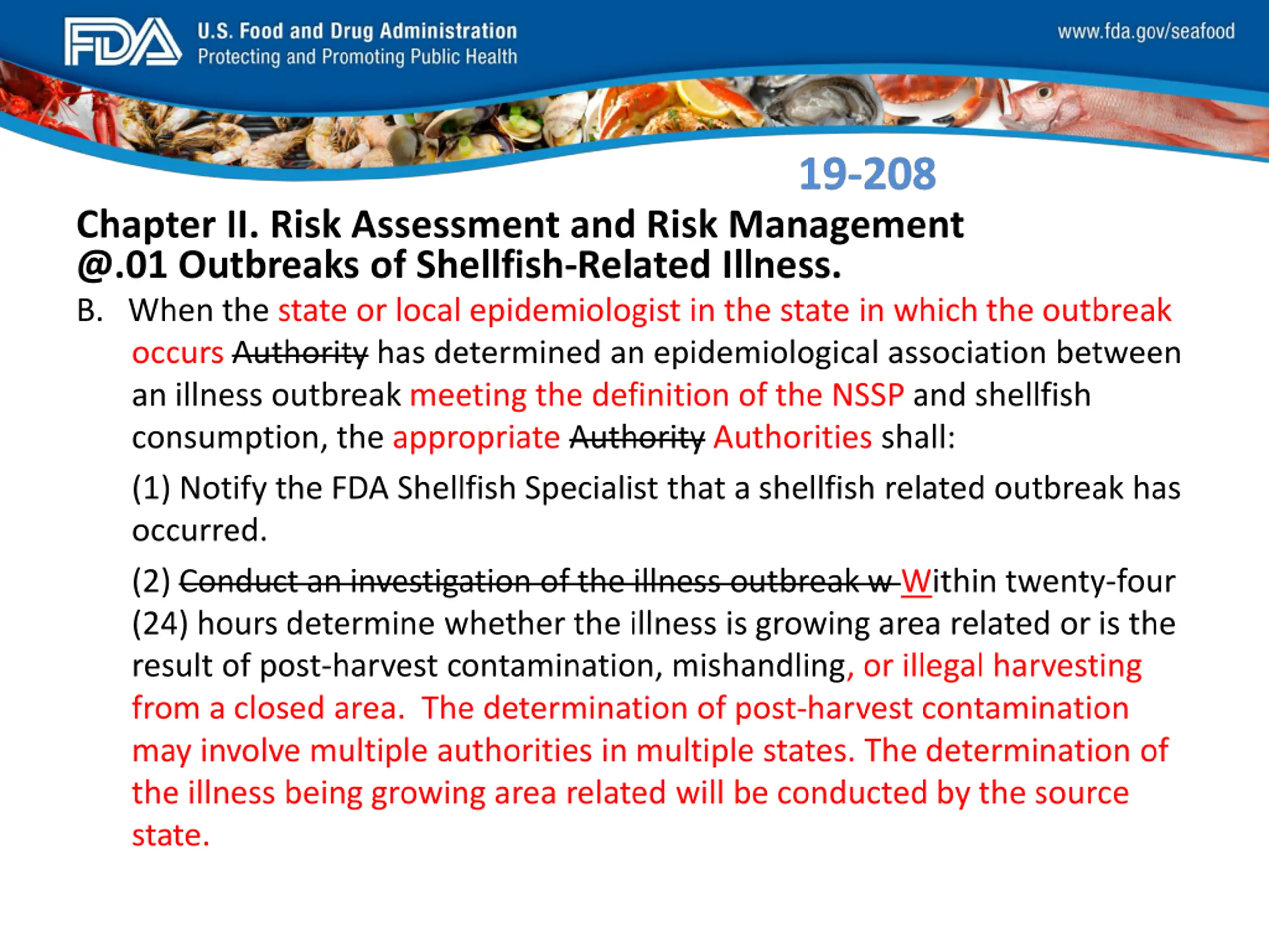FDA_Swish_SeafoodXXX.png Chapter II. Risk Assessment and Risk Management @.01 Outbreaks of Shellfish-Related Illness. B. When the state or local epidemiologist in the state in which the outbreak occurs Authority has determined an epidemiological association between an illness outbreak meeting the definition of the NSSP and shellfish consumption, the appropriate Authority Authorities shall: (1) Notify the FDA Shellfish Specialist that a shellfish related outbreak has occurred. (2) Conduct an investigation of the illness outbreak w Within twenty-four (24) hours determine whether the illness is growing area related or is the result of post-harvest contamination, mishandling, or illegal harvesting from a closed area. The determination of post-harvest contamination may involve multiple authorities in multiple states. The determination of the illness being growing area related will be conducted by the source state.