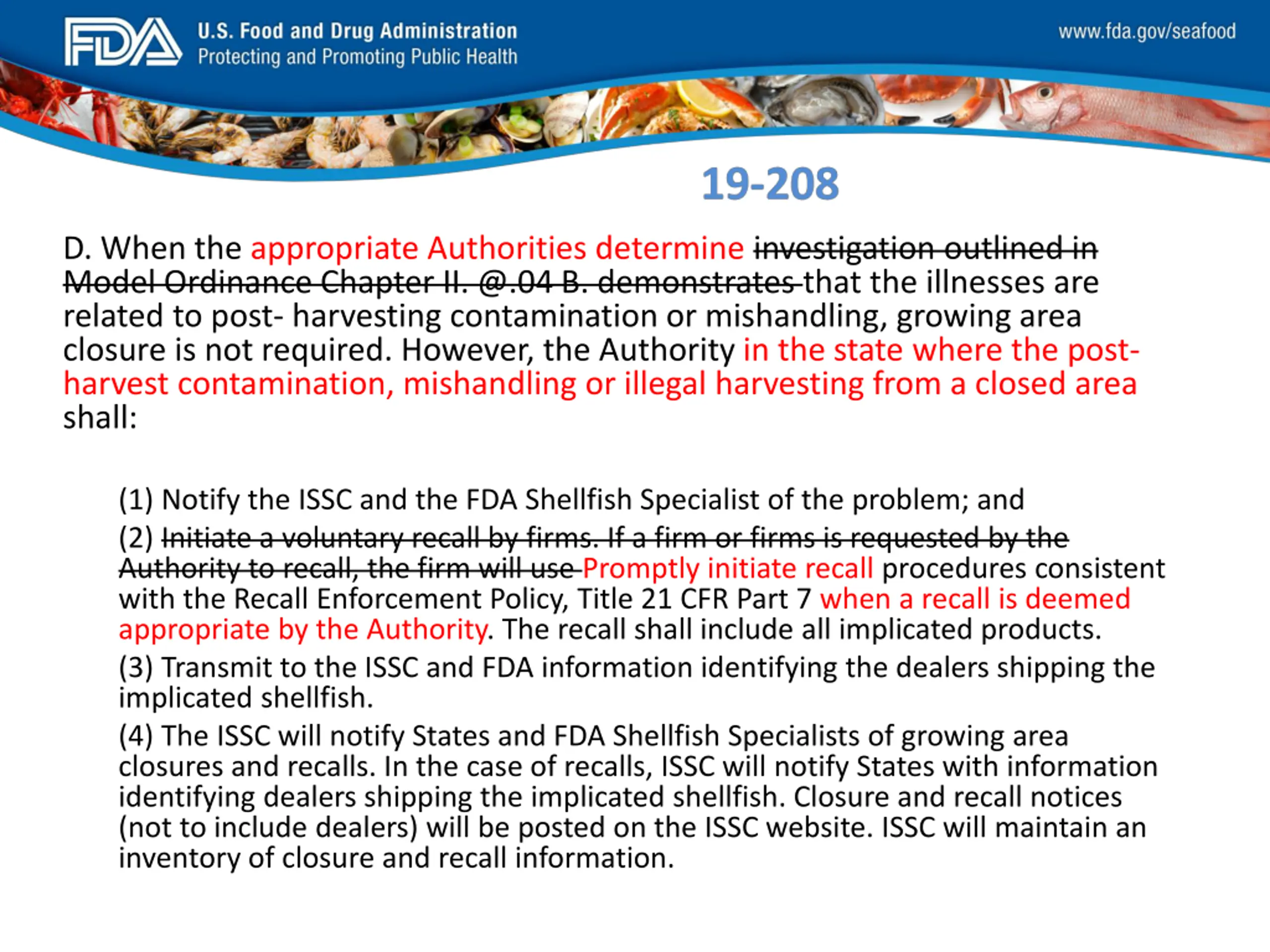 FDA_Swish_SeafoodXXX.png (6) When the investigation outlined in Model Ordinance Chapter II. @.02 A.4. does not indicate a post-harvest contamination problem, or illegal harvesting from a closed area, the Authority shall: (a) Follow the procedures outlined in Chapter II @.02 A. 1, 2 and 3. (b) Immediately place the implicated portion(s) of the harvest area(s) in the closed status; (c) (b)Notify the ISSC and the FDA Shellfish Specialist that a potential health risk is associated with shellfish harvested from the implicated growing area; (d) (c)Promptly initiate recall procedures consistent with the Recall Enforcement Policy, Title 21 CFR Part 7. The recall shall include all implicated products. If a recall is required by Chapter II @.02 A. 3.