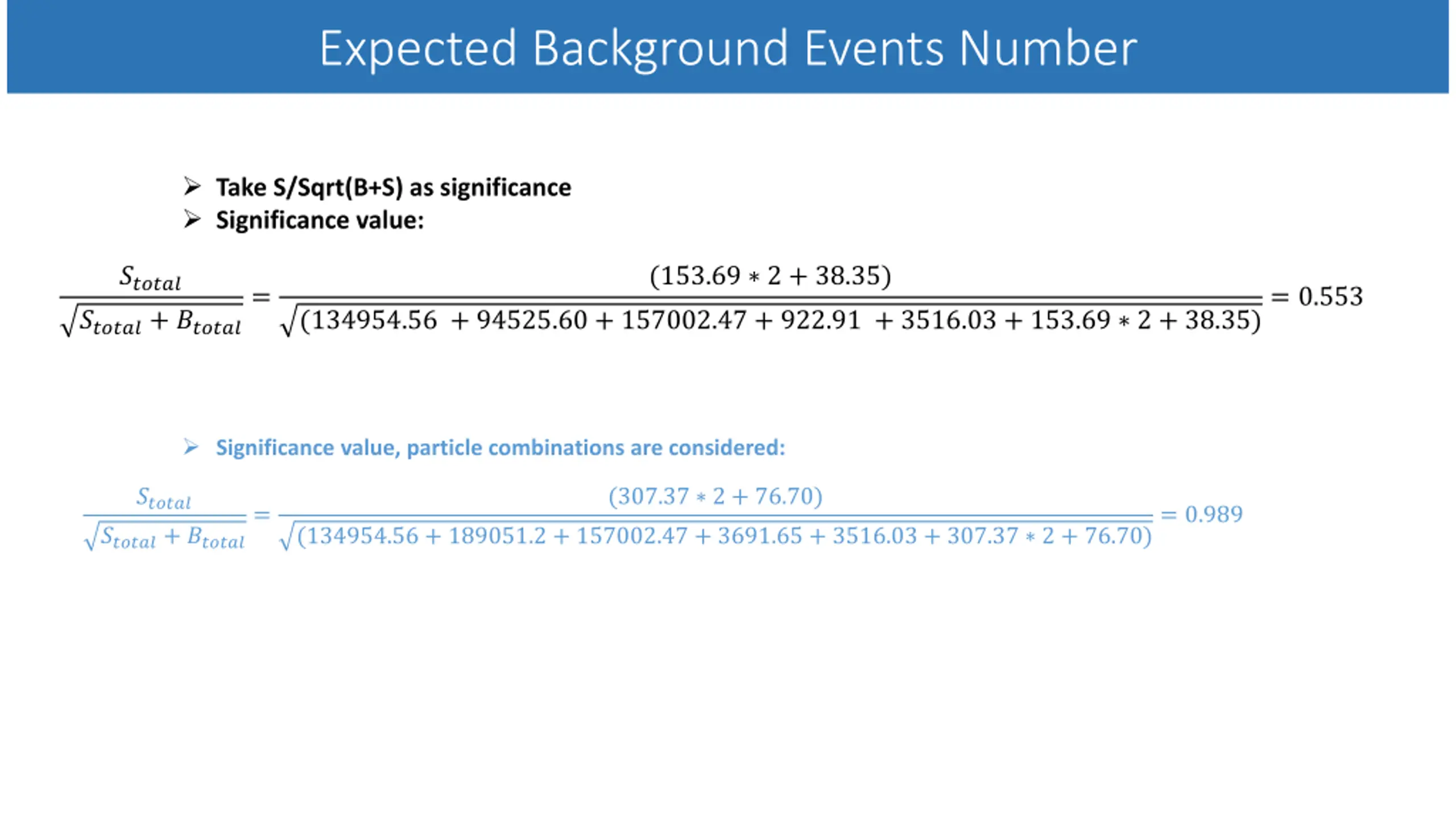 Expected Background Events Number Take S/Sqrt(B+S) as significance Significance value: ?????? (153.69 2 + 38.35) = = 0.553 ??????+ ?????? (134954.56 + 94525.60 + 157002.47 + 922.91 + 3516.03 + 153.69 2 + 38.35) Significance value, particle combinations are considered: ?????? (307.37 2 + 76.70) = = 0.989 ??????+ ?????? (134954.56 + 189051.2 + 157002.47 + 3691.65 + 3516.03 + 307.37 2 + 76.70)