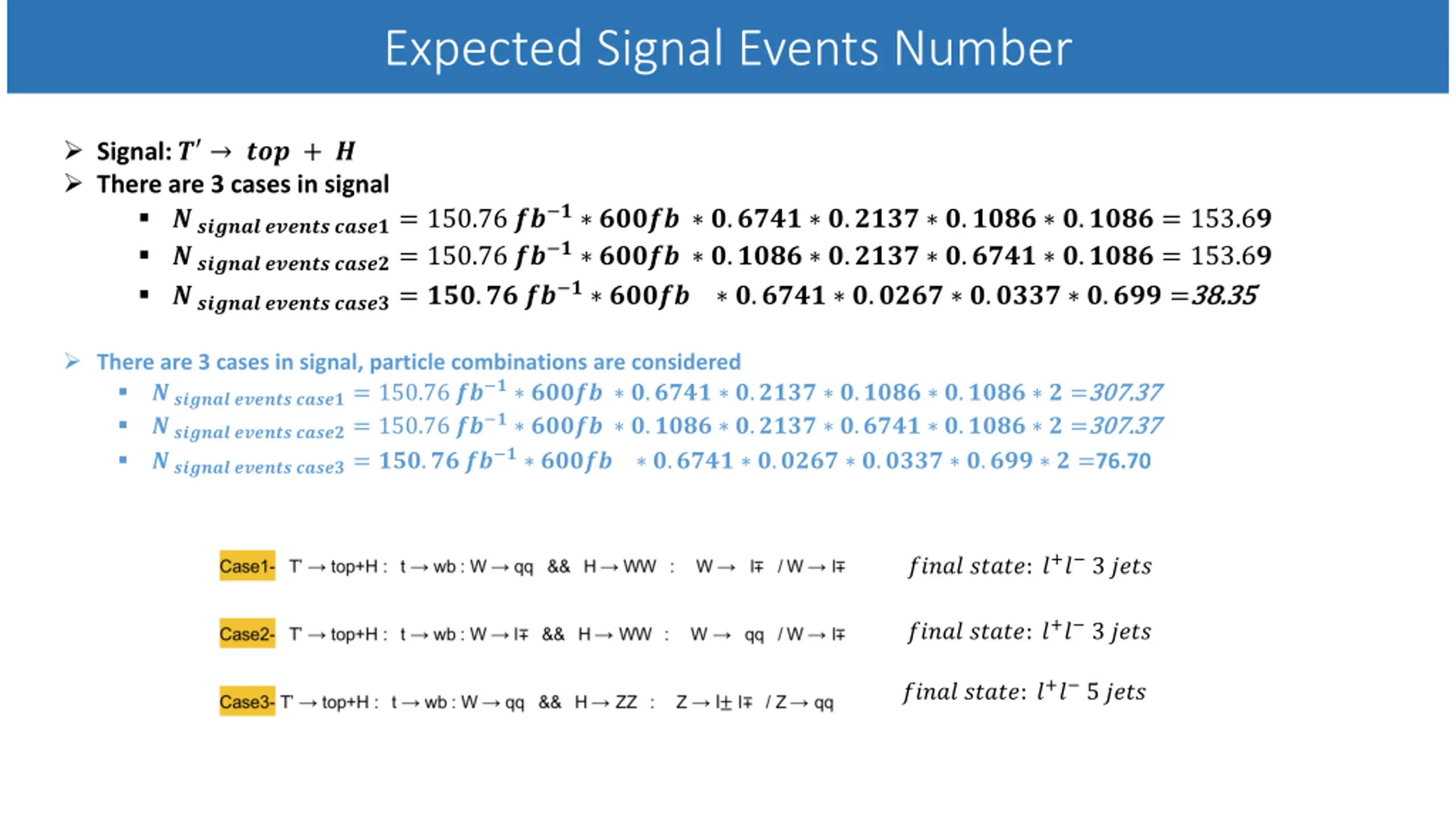 Expected Signal Events Number Signal: ? ??? + ? There are 3 cases in signal ? ?????? ?????? ?????= 150.76 ?? ? ????? ?.???? ?.???? ?.???? ?.???? = 153.6? ? ?????? ?????? ?????= 150.76 ?? ? ????? ?.???? ?.???? ?.???? ?.???? = 153.6? ? ?????? ?????? ?????= ???.?? ?? ? ????? ?.???? ?.???? ?.???? ?.??? =38.35 38.35 There are 3 cases in signal, particle combinations are considered ? ?????? ?????? ?????= 150.76 ?? ? ????? ?.???? ?.???? ?.???? ?.???? ? =307.37 ? ?????? ?????? ?????= 150.76 ?? ? ????? ?.???? ?.???? ?.???? ?.???? ? =307.37 ? ?????? ?????? ?????= ???.?? ?? ? ????? 307.37 307.37 ?.???? ?.???? ?.???? ?.??? ? =76.70 ????? ?????: ?+? 3 ???? ????? ?????: ?+? 3 ???? ????? ?????: ?+? 5 ????