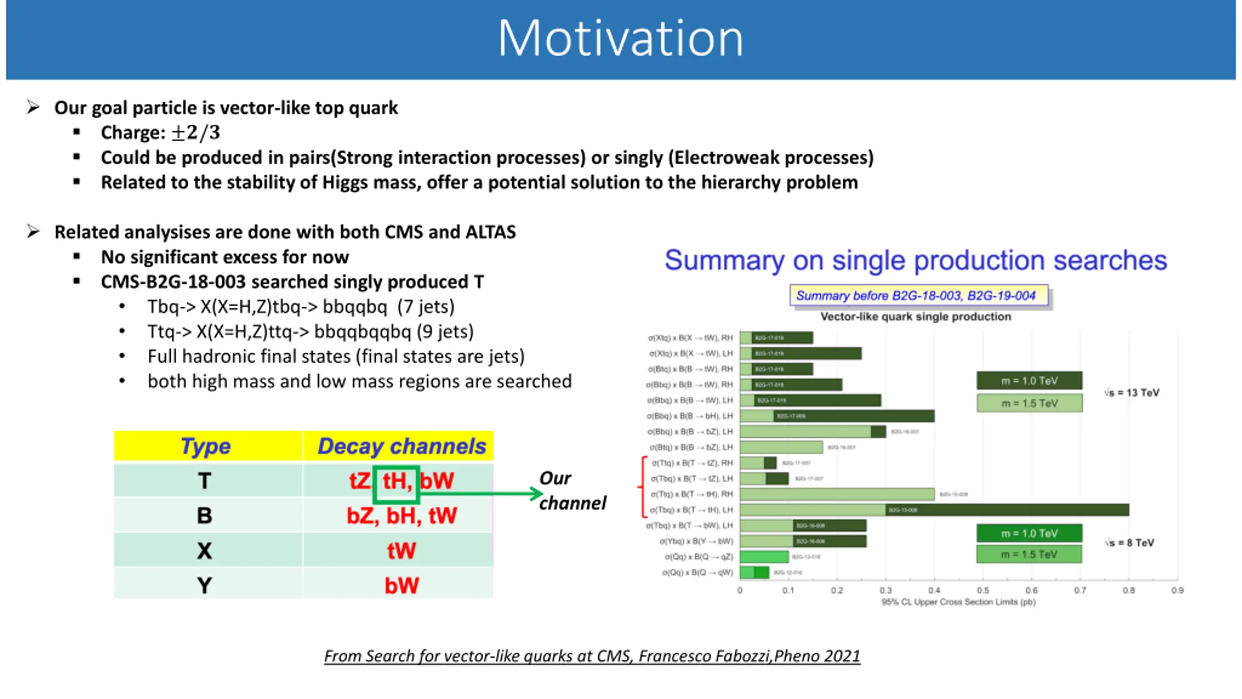 Motivation Our goal particle is vector-like top quark Charge: ?/? Could be produced in pairs(Strong interaction processes) or singly (Electroweak processes) Related to the stability of Higgs mass, offer a potential solution to the hierarchy problem Related analysises are done with both CMS and ALTAS No significant excess for now CMS-B2G-18-003 searched singly produced T Tbq-> X(X=H,Z)tbq-> bbqqbq (7 jets) Ttq-> X(X=H,Z)ttq-> bbqqbqqbq (9 jets) Full hadronic final states (final states are jets) both high mass and low mass regions are searched Our channel From Search for vector-like quarks at CMS, Francesco Fabozzi,Pheno 2021
