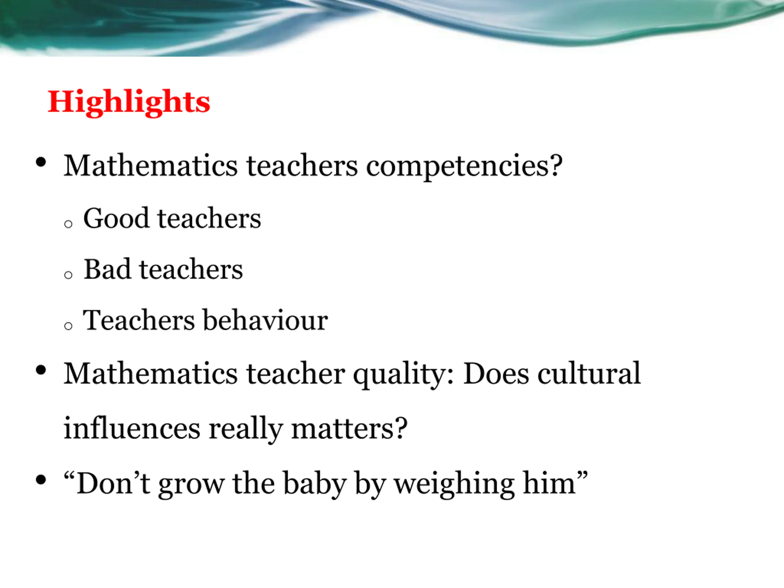 Highlights Mathematics teachers competencies? o Good teachers o Bad teachers o Teachers behaviour Mathematics teacher quality: Does cultural influences really matters? Don t grow the baby by weighing him