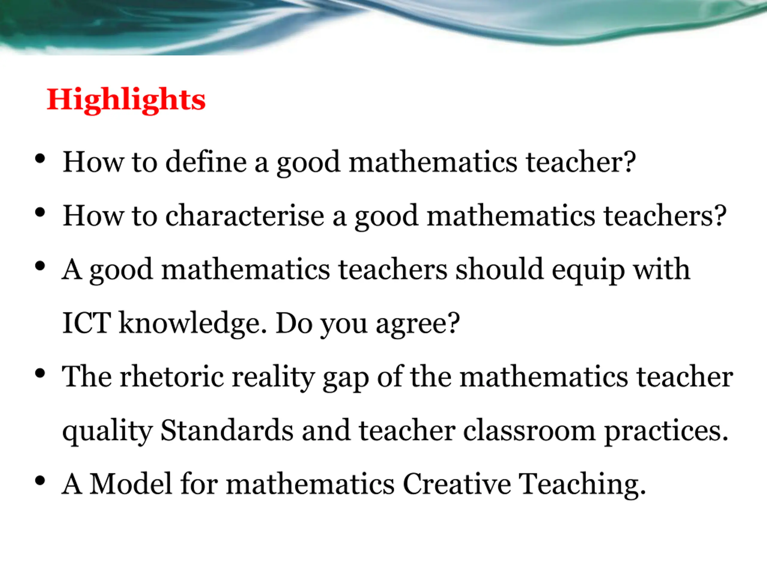 Highlights How to define a good mathematics teacher? How to characterise a good mathematics teachers? A good mathematics teachers should equip with ICT knowledge. Do you agree? The rhetoric reality gap of the mathematics teacher quality Standards and teacher classroom practices. A Model for mathematics Creative Teaching.