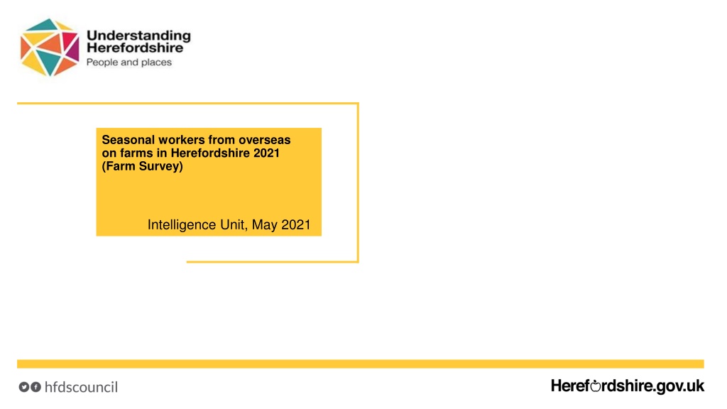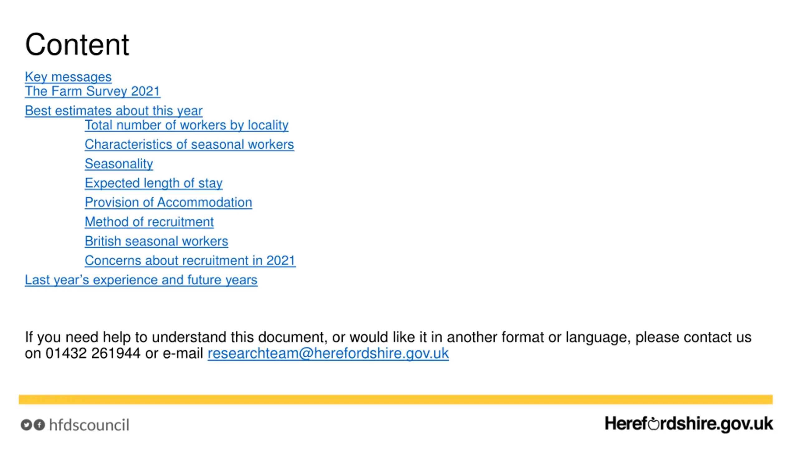 Content Key messages The Farm Survey 2021 Best estimates about this year Total number of workers by locality Characteristics of seasonal workers Seasonality Expected length of stay Provision of Accommodation Method of recruitment British seasonal workers Concerns about recruitment in 2021 Last year s experience and future years If you need help to understand this document, or would like it in another format or language, please contact us on 01432 261944 or e-mail researchteam@herefordshire.gov.uk