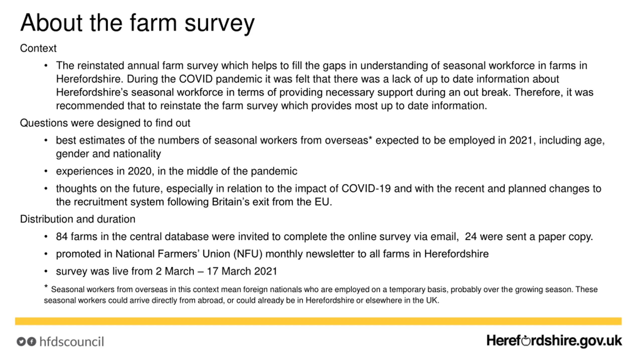 About the farm survey Context The reinstated annual farm survey which helps to fill the gaps in understanding of seasonal workforce in farms in Herefordshire. During the COVID pandemic it was felt that there was a lack of up to date information about Herefordshire s seasonal workforce in terms of providing necessary support during an out break. Therefore, it was recommended that to reinstate the farm survey which provides most up to date information. Questions were designed to find out best estimates of the numbers of seasonal workers from overseas* expected to be employed in 2021, including age, gender and nationality experiences in 2020, in the middle of the pandemic thoughts on the future, especially in relation to the impact of COVID-19 and with the recent and planned changes to the recruitment system following Britain s exit from the EU. Distribution and duration 84 farms in the central database were invited to complete the online survey via email, 24 were sent a paper copy. promoted in National Farmers Union (NFU) monthly newsletter to all farms in Herefordshire survey was live from 2 March 17 March 2021 * Seasonal workers from overseas in this context mean foreign nationals who are employed on a temporary basis, probably over the growing season. These seasonal workers could arrive directly from abroad, or could already be in Herefordshire or elsewhere in the UK.