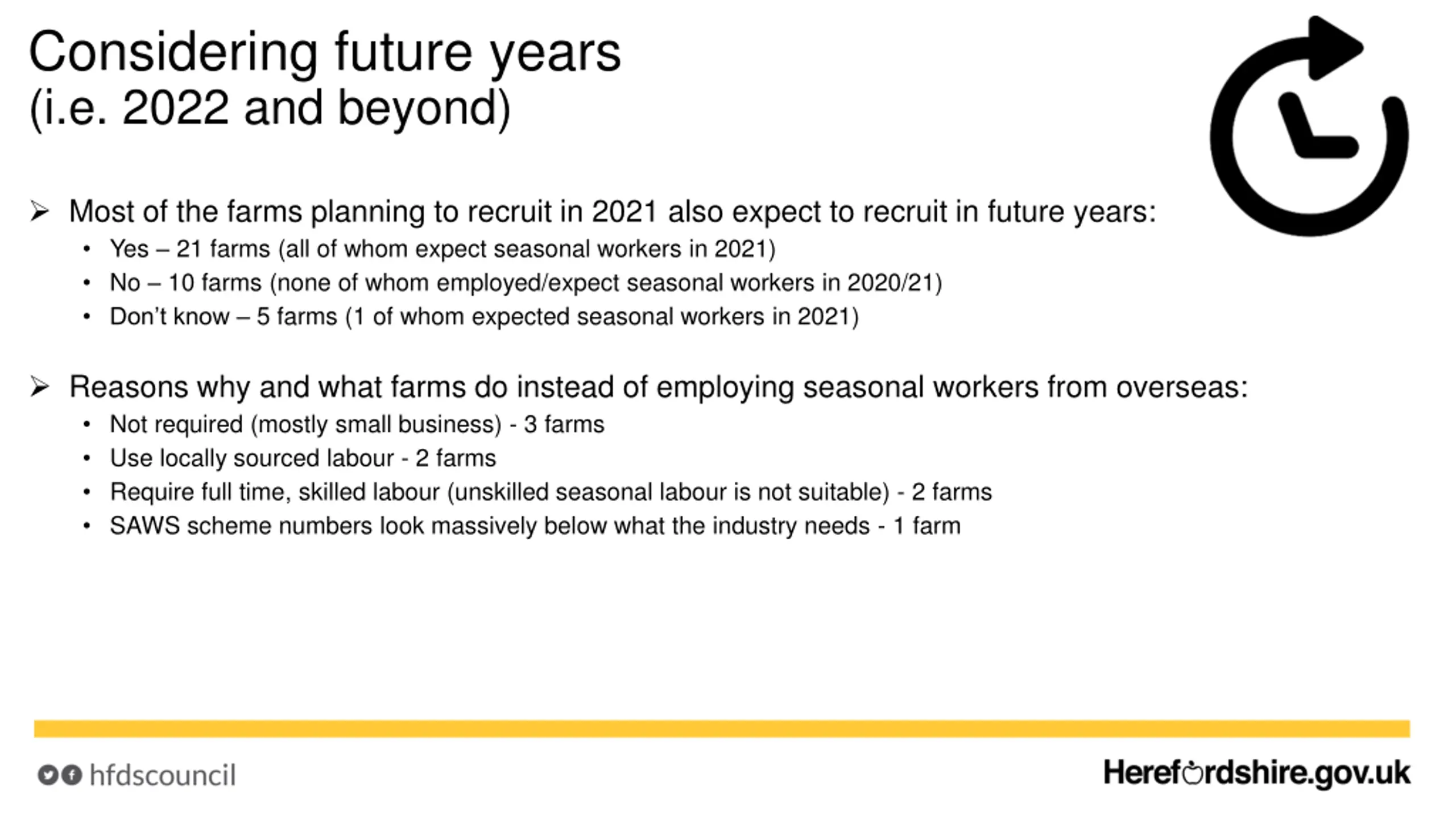 Considering future years (i.e. 2022 and beyond) Most of the farms planning to recruit in 2021 also expect to recruit in future years: Yes 21 farms (all of whom expect seasonal workers in 2021) No 10 farms (none of whom employed/expect seasonal workers in 2020/21) Don t know 5 farms (1 of whom expected seasonal workers in 2021) Reasons why and what farms do instead of employing seasonal workers from overseas: Not required (mostly small business) - 3 farms Use locally sourced labour - 2 farms Require full time, skilled labour (unskilled seasonal labour is not suitable) - 2 farms SAWS scheme numbers look massively below what the industry needs - 1 farm