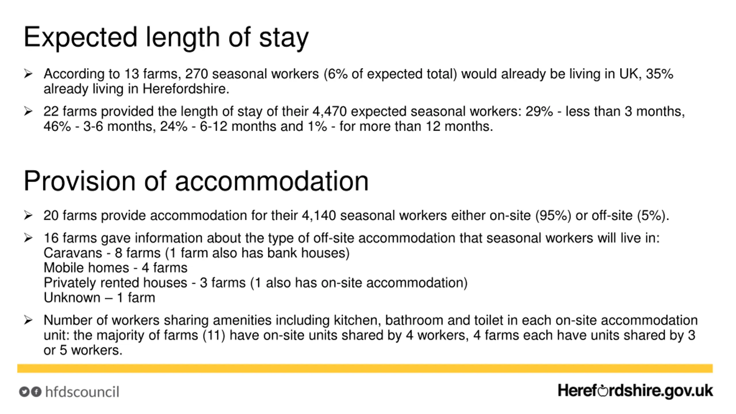 Expected length of stay According to 13 farms, 270 seasonal workers (6% of expected total) would already be living in UK, 35% already living in Herefordshire. 22 farms provided the length of stay of their 4,470 expected seasonal workers: 29% - less than 3 months, 46% - 3-6 months, 24% - 6-12 months and 1% - for more than 12 months. Provision of accommodation 20 farms provide accommodation for their 4,140 seasonal workers either on-site (95%) or off-site (5%). 16 farms gave information about the type of off-site accommodation that seasonal workers will live in: Caravans - 8 farms (1 farm also has bank houses) Mobile homes - 4 farms Privately rented houses - 3 farms (1 also has on-site accommodation) Unknown 1 farm Number of workers sharing amenities including kitchen, bathroom and toilet in each on-site accommodation unit: the majority of farms (11) have on-site units shared by 4 workers, 4 farms each have units shared by 3 or 5 workers.