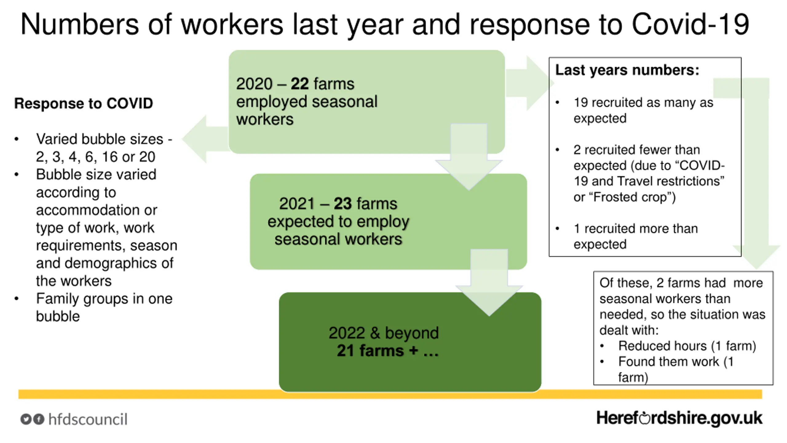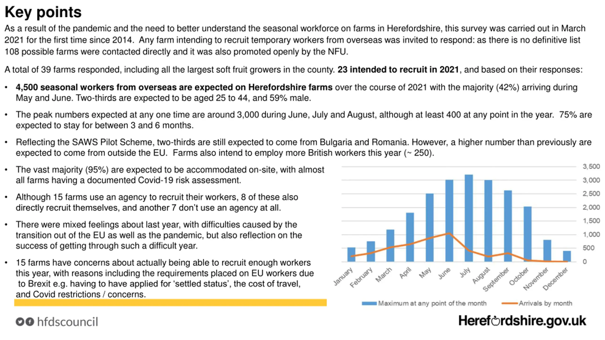 Key points As a result of the pandemic and the need to better understand the seasonal workforce on farms in Herefordshire, this survey was carried out in March 2021 for the first time since 2014. Any farm intending to recruit temporary workers from overseas was invited to respond: as there is no definitive list 108 possible farms were contacted directly and it was also promoted openly by the NFU. A total of 39 farms responded, including all the largest soft fruit growers in the county. 23 intended to recruit in 2021, and based on their responses: 4,500 seasonal workers from overseas are expected on Herefordshire farms over the course of 2021 with the majority (42%) arriving during May and June. Two-thirds are expected to be aged 25 to 44, and 59% male. The peak numbers expected at any one time are around 3,000 during June, July and August, although at least 400 at any point in the year. 75% are expected to stay for between 3 and 6 months. Reflecting the SAWS Pilot Scheme, two-thirds are still expected to come from Bulgaria and Romania. However, a higher number than previously are expected to come from outside the EU. Farms also intend to employ more British workers this year (~ 250). The vast majority (95%) are expected to be accommodated on-site, with almost all farms having a documented Covid-19 risk assessment. Although 15 farms use an agency to recruit their workers, 8 of these also directly recruit themselves, and another 7 don t use an agency at all. There were mixed feelings about last year, with difficulties caused by the transition out of the EU as well as the pandemic, but also reflection on the success of getting through such a difficult year. 15 farms have concerns about actually being able to recruit enough workers this year, with reasons including the requirements placed on EU workers due to Brexit e.g. having to have applied for settled status , the cost of travel, and Covid restrictions / concerns.