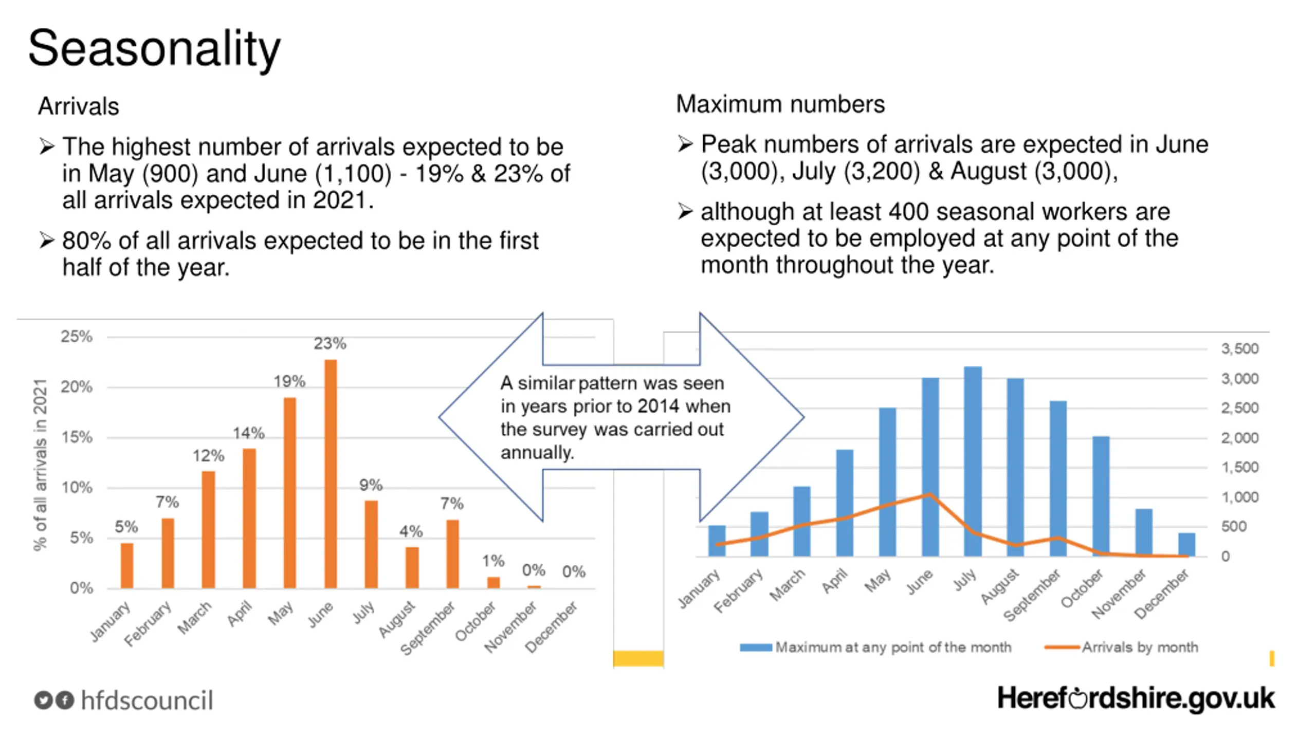Seasonality Maximum numbers Peak numbers of arrivals are expected in June (3,000), July (3,200) & August (3,000), although at least 400 seasonal workers are expected to be employed at any point of the month throughout the year. Arrivals The highest number of arrivals expected to be in May (900) and June (1,100) - 19% & 23% of all arrivals expected in 2021. 80% of all arrivals expected to be in the first half of the year.