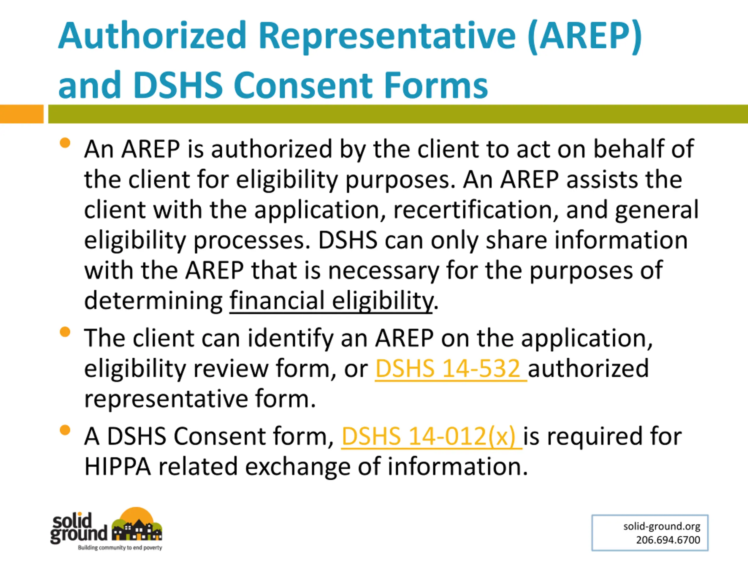 Authorized Representative (AREP) and DSHS Consent Forms An AREP is authorized by the client to act on behalf of the client for eligibility purposes. An AREP assists the client with the application, recertification, and general eligibility processes. DSHS can only share information with the AREP that is necessary for the purposes of determining financial eligibility. The client can identify an AREP on the application, eligibility review form, or DSHS 14-532 authorized representative form. A DSHS Consent form, DSHS 14-012(x) is required for HIPPA related exchange of information. solid-ground.org 206.694.6700
