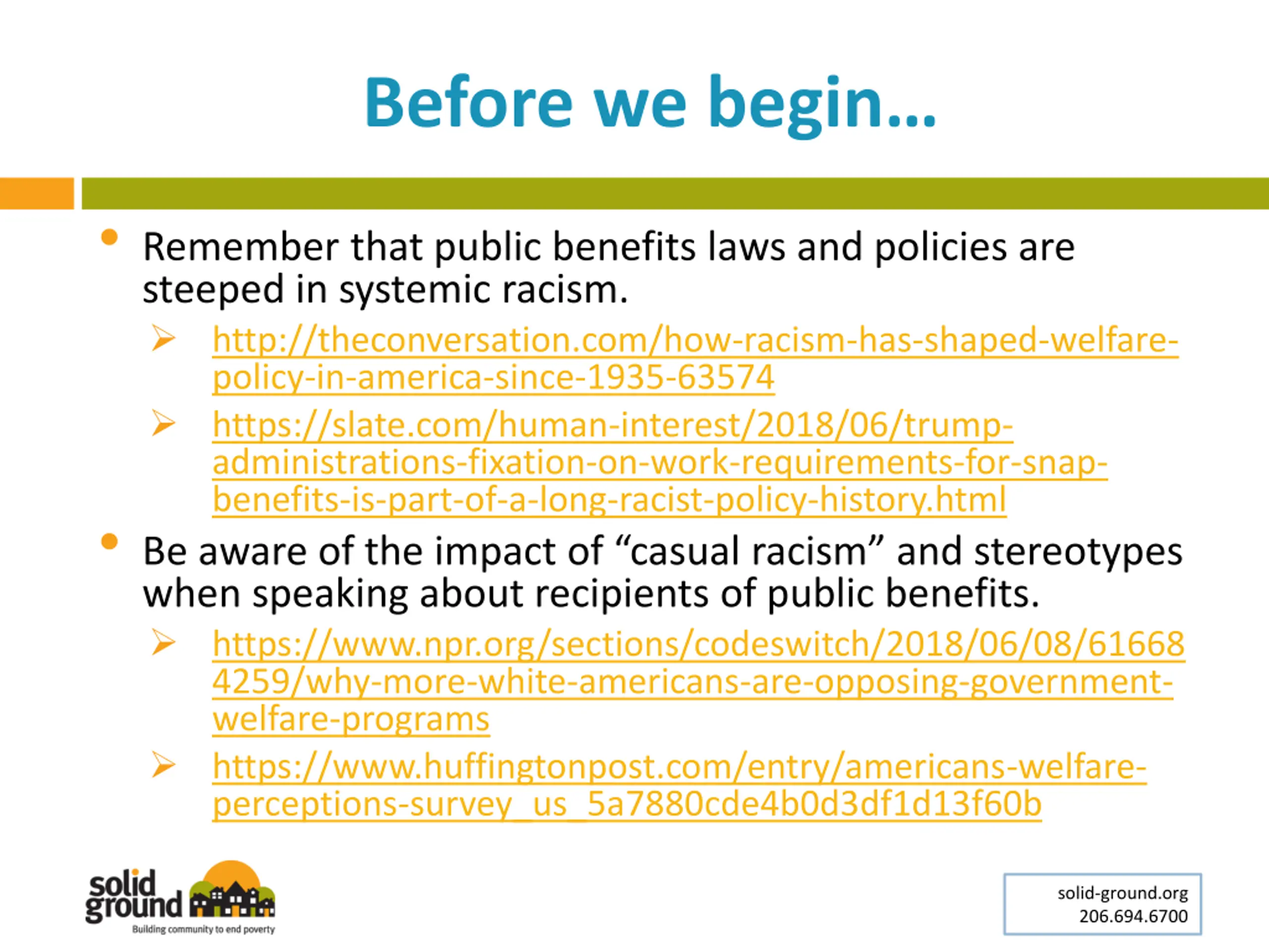 Before we begin Remember that public benefits laws and policies are steeped in systemic racism. http://theconversation.com/how-racism-has-shaped-welfare- policy-in-america-since-1935-63574 https://slate.com/human-interest/2018/06/trump- administrations-fixation-on-work-requirements-for-snap- benefits-is-part-of-a-long-racist-policy-history.html Be aware of the impact of casual racism and stereotypes when speaking about recipients of public benefits. https://www.npr.org/sections/codeswitch/2018/06/08/61668 4259/why-more-white-americans-are-opposing-government- welfare-programs https://www.huffingtonpost.com/entry/americans-welfare- perceptions-survey_us_5a7880cde4b0d3df1d13f60b solid-ground.org 206.694.6700