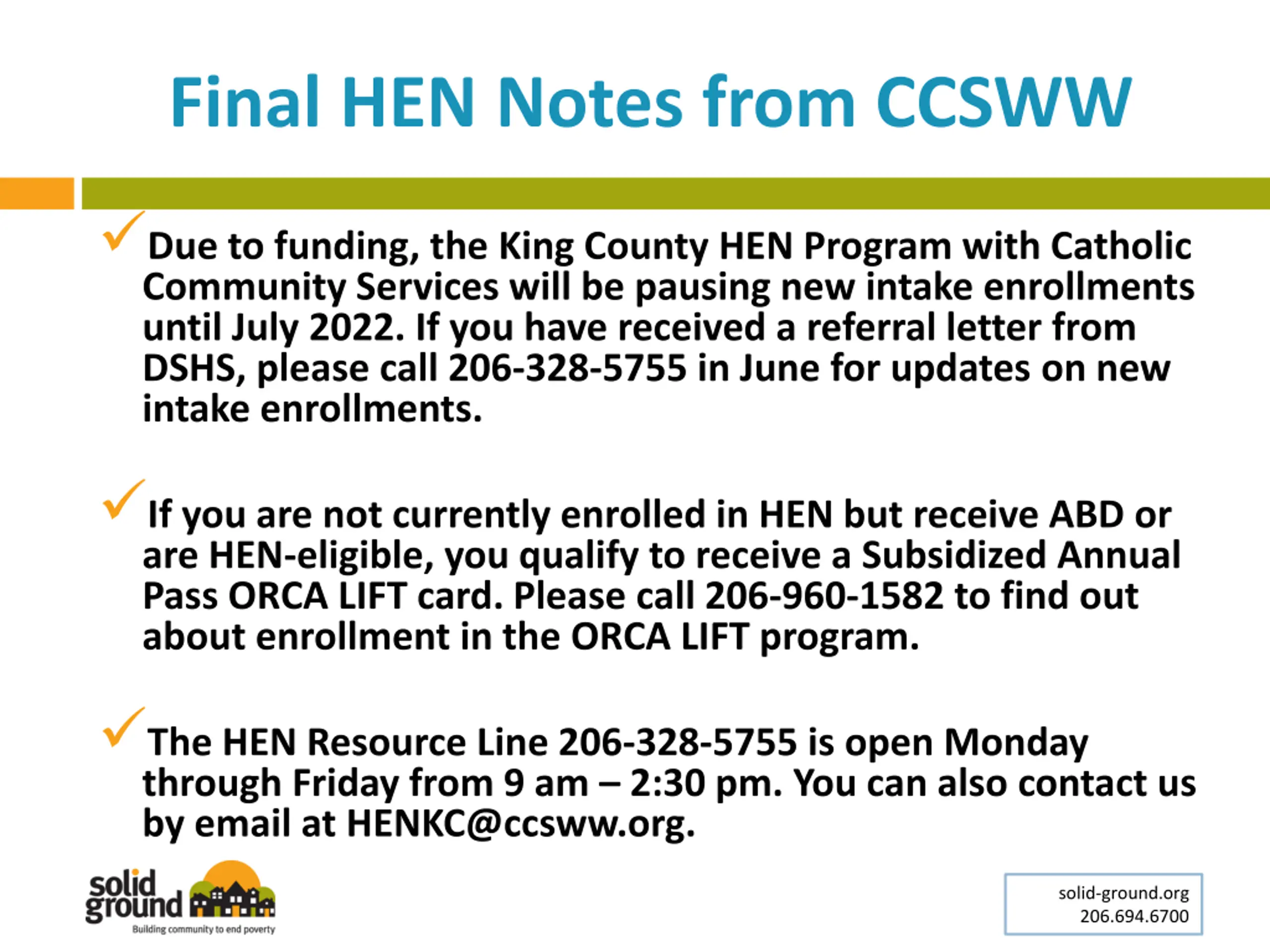 Final HEN Notes from CCSWW Due to funding, the King County HEN Program with Catholic Community Services will be pausing new intake enrollments until July 2022. If you have received a referral letter from DSHS, please call 206-328-5755 in June for updates on new intake enrollments. If you are not currently enrolled in HEN but receive ABD or are HEN-eligible, you qualify to receive a Subsidized Annual Pass ORCA LIFT card. Please call 206-960-1582 to find out about enrollment in the ORCA LIFT program. The HEN Resource Line 206-328-5755 is open Monday through Friday from 9 am 2:30 pm. You can also contact us by email at HENKC@ccsww.org. solid-ground.org 206.694.6700