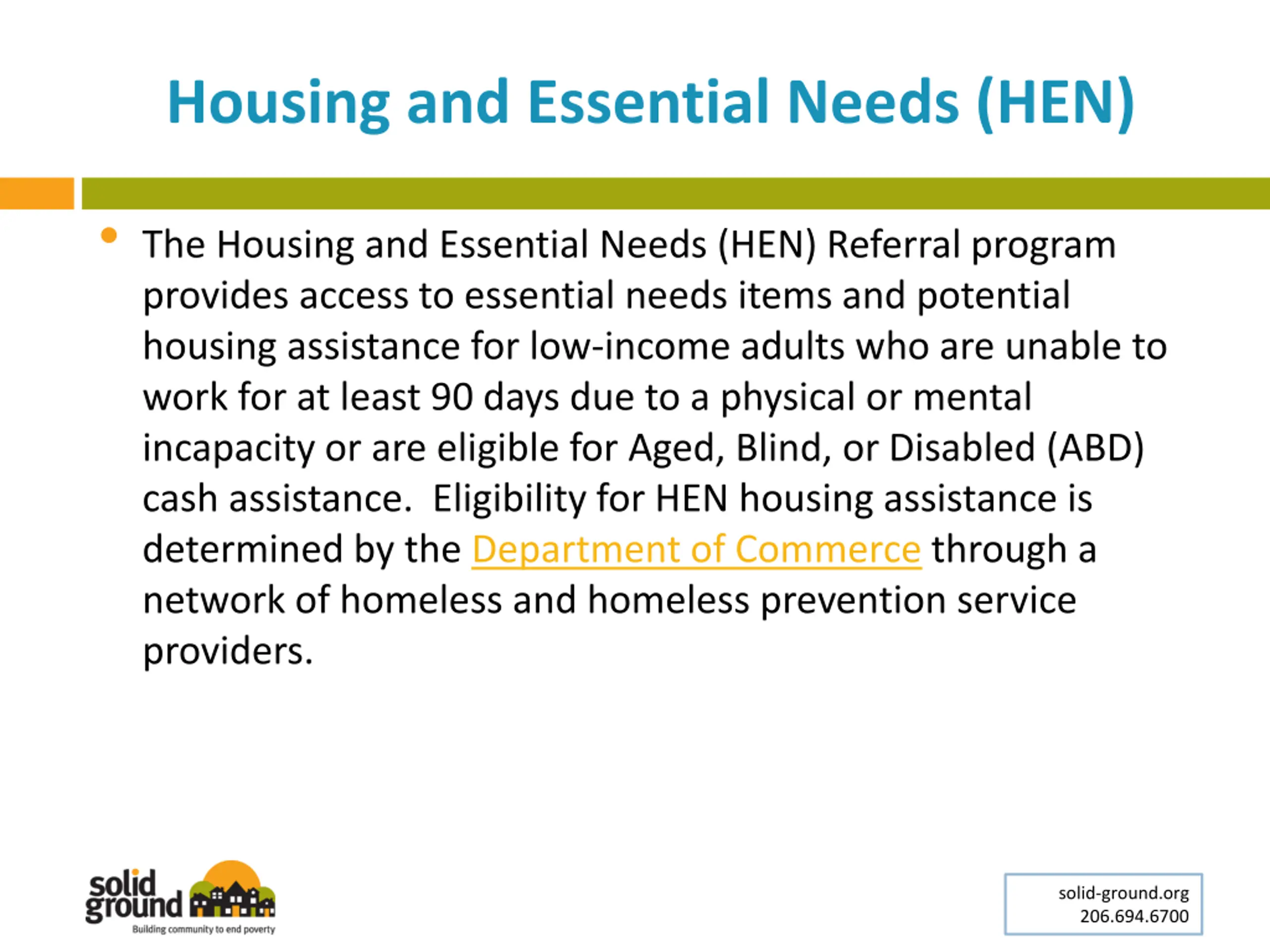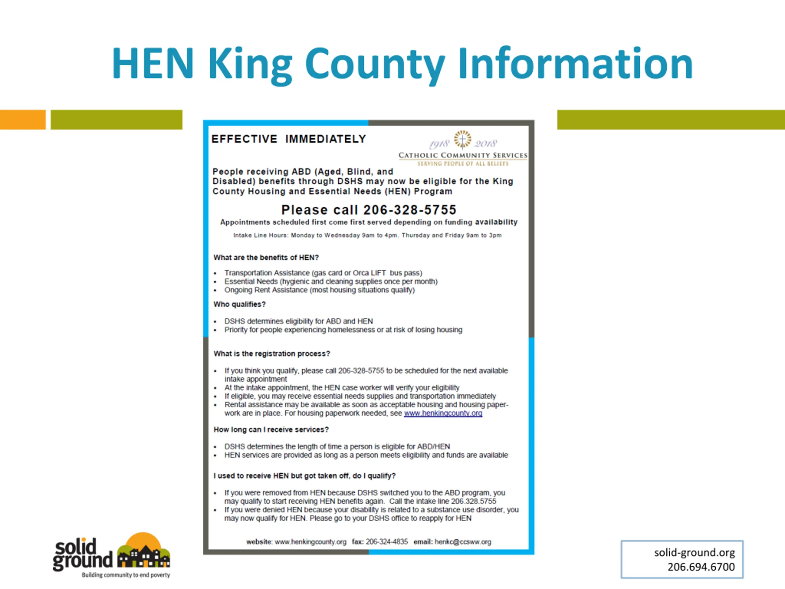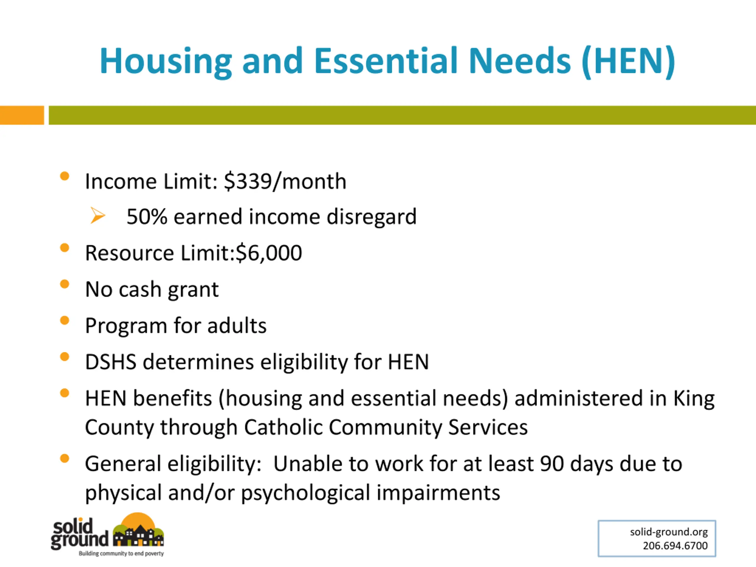 Housing and Essential Needs (HEN) Income Limit: $339/month 50% earned income disregard Resource Limit:$6,000 No cash grant Program for adults DSHS determines eligibility for HEN HEN benefits (housing and essential needs) administered in King County through Catholic Community Services General eligibility: Unable to work for at least 90 days due to physical and/or psychological impairments solid-ground.org 206.694.6700