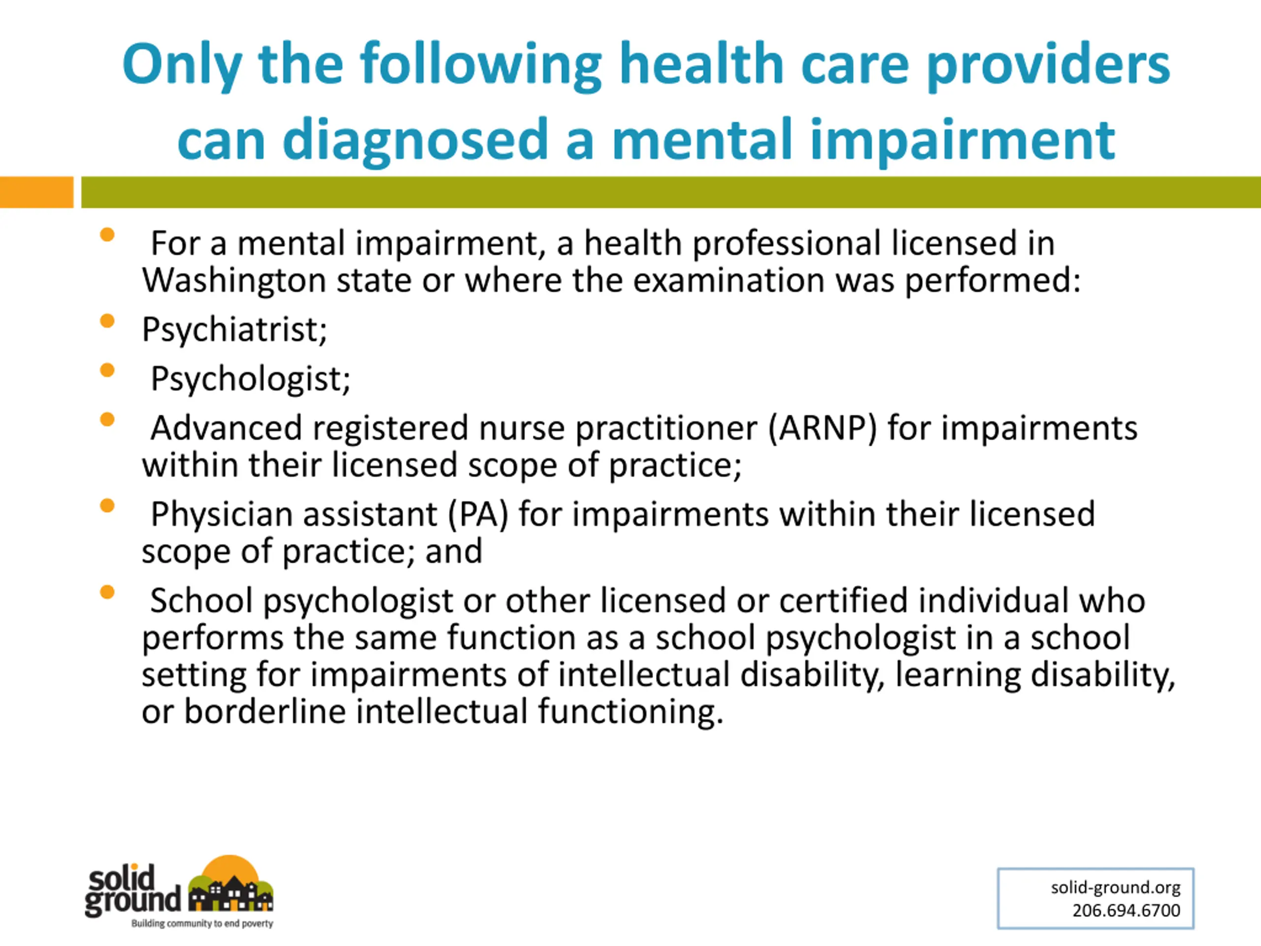 Only the following health care providers can diagnosed a mental impairment For a mental impairment, a health professional licensed in Washington state or where the examination was performed: Psychiatrist; Psychologist; Advanced registered nurse practitioner (ARNP) for impairments within their licensed scope of practice; Physician assistant (PA) for impairments within their licensed scope of practice; and School psychologist or other licensed or certified individual who performs the same function as a school psychologist in a school setting for impairments of intellectual disability, learning disability, or borderline intellectual functioning. solid-ground.org 206.694.6700
