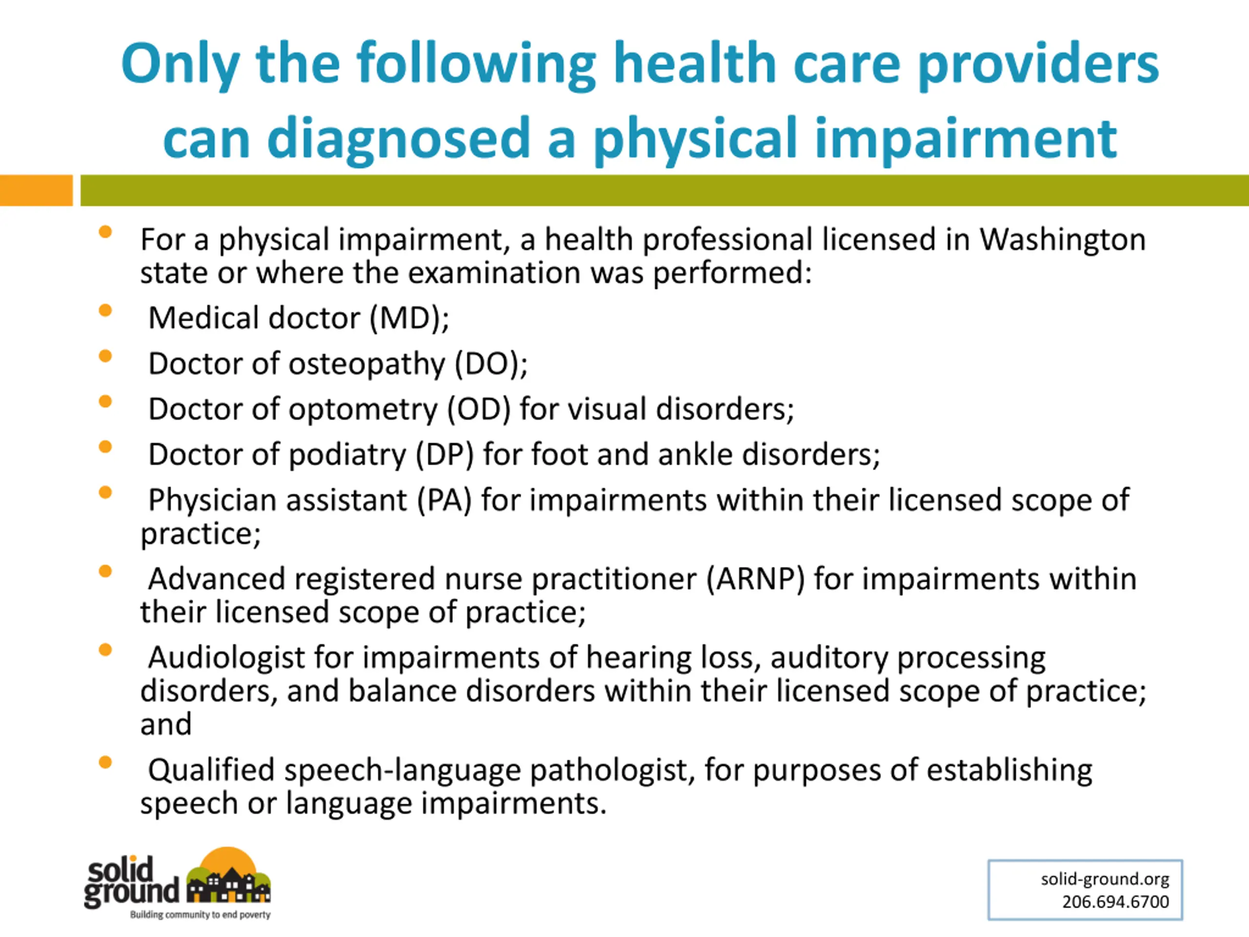 Only the following health care providers can diagnosed a physical impairment For a physical impairment, a health professional licensed in Washington state or where the examination was performed: Medical doctor (MD); Doctor of osteopathy (DO); Doctor of optometry (OD) for visual disorders; Doctor of podiatry (DP) for foot and ankle disorders; Physician assistant (PA) for impairments within their licensed scope of practice; Advanced registered nurse practitioner (ARNP) for impairments within their licensed scope of practice; Audiologist for impairments of hearing loss, auditory processing disorders, and balance disorders within their licensed scope of practice; and Qualified speech-language pathologist, for purposes of establishing speech or language impairments. solid-ground.org 206.694.6700