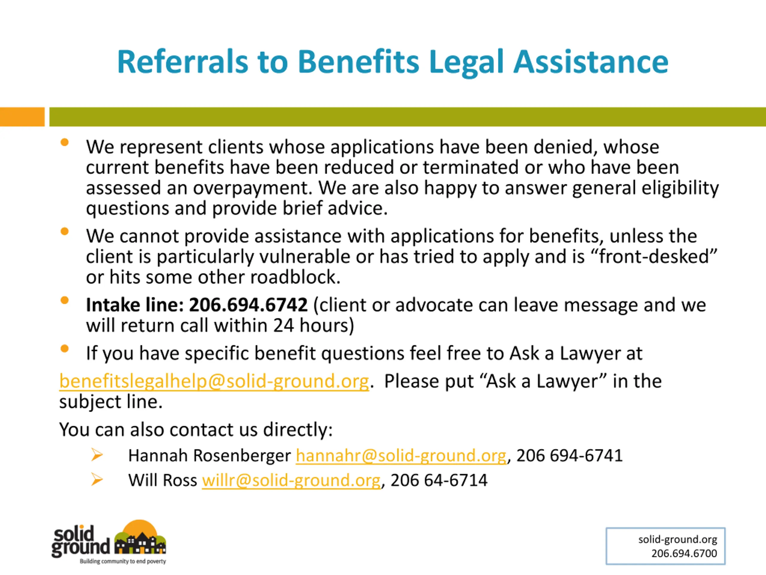 Referrals to Benefits Legal Assistance We represent clients whose applications have been denied, whose current benefits have been reduced or terminated or who have been assessed an overpayment. We are also happy to answer general eligibility questions and provide brief advice. We cannot provide assistance with applications for benefits, unless the client is particularly vulnerable or has tried to apply and is front-desked or hits some other roadblock. Intake line: 206.694.6742 (client or advocate can leave message and we will return call within 24 hours) If you have specific benefit questions feel free to Ask a Lawyer at benefitslegalhelp@solid-ground.org. Please put Ask a Lawyer in the subject line. You can also contact us directly: Hannah Rosenberger hannahr@solid-ground.org, 206 694-6741 Will Ross willr@solid-ground.org, 206 64-6714 solid-ground.org 206.694.6700