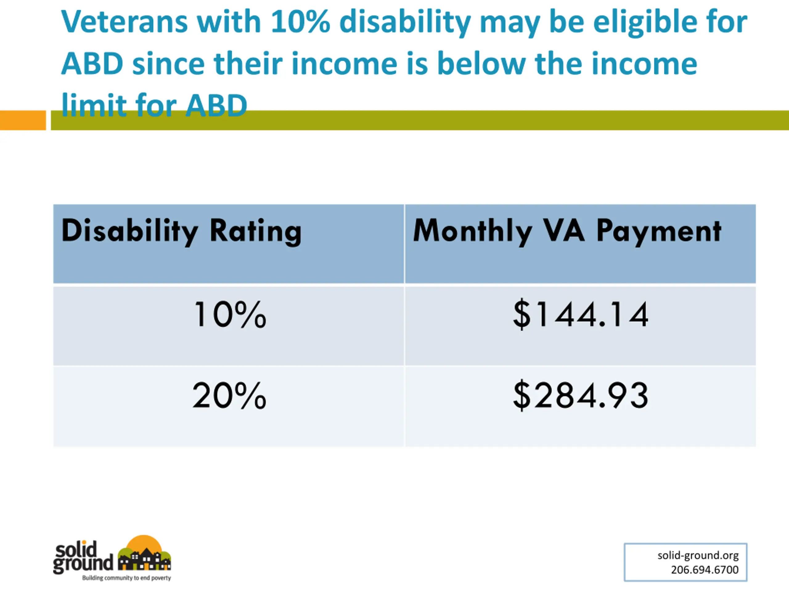 Veterans with 10% disability may be eligible for ABD since their income is below the income limit for ABD Disability Rating Monthly VA Payment 10% $144.14 20% $284.93 solid-ground.org 206.694.6700
