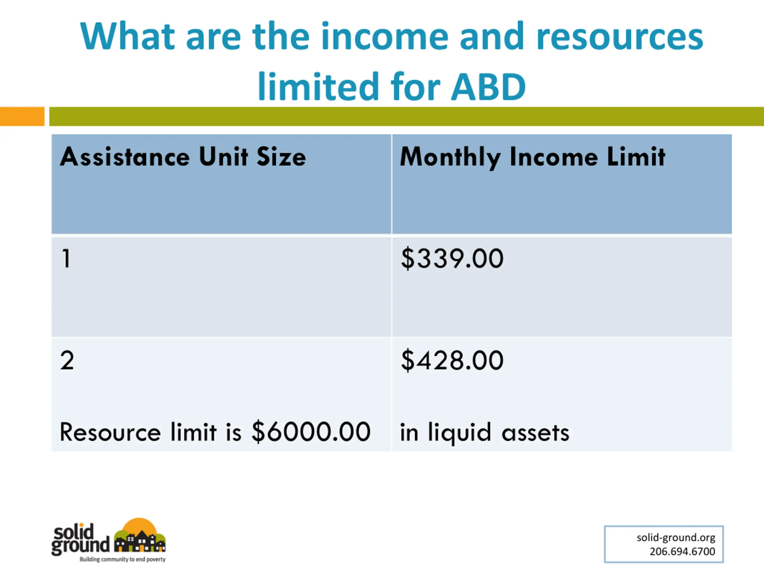 What are the income and resources limited for ABD Assistance Unit Size Monthly Income Limit 1 $339.00 2 $428.00 Resource limit is $6000.00 in liquid assets solid-ground.org 206.694.6700