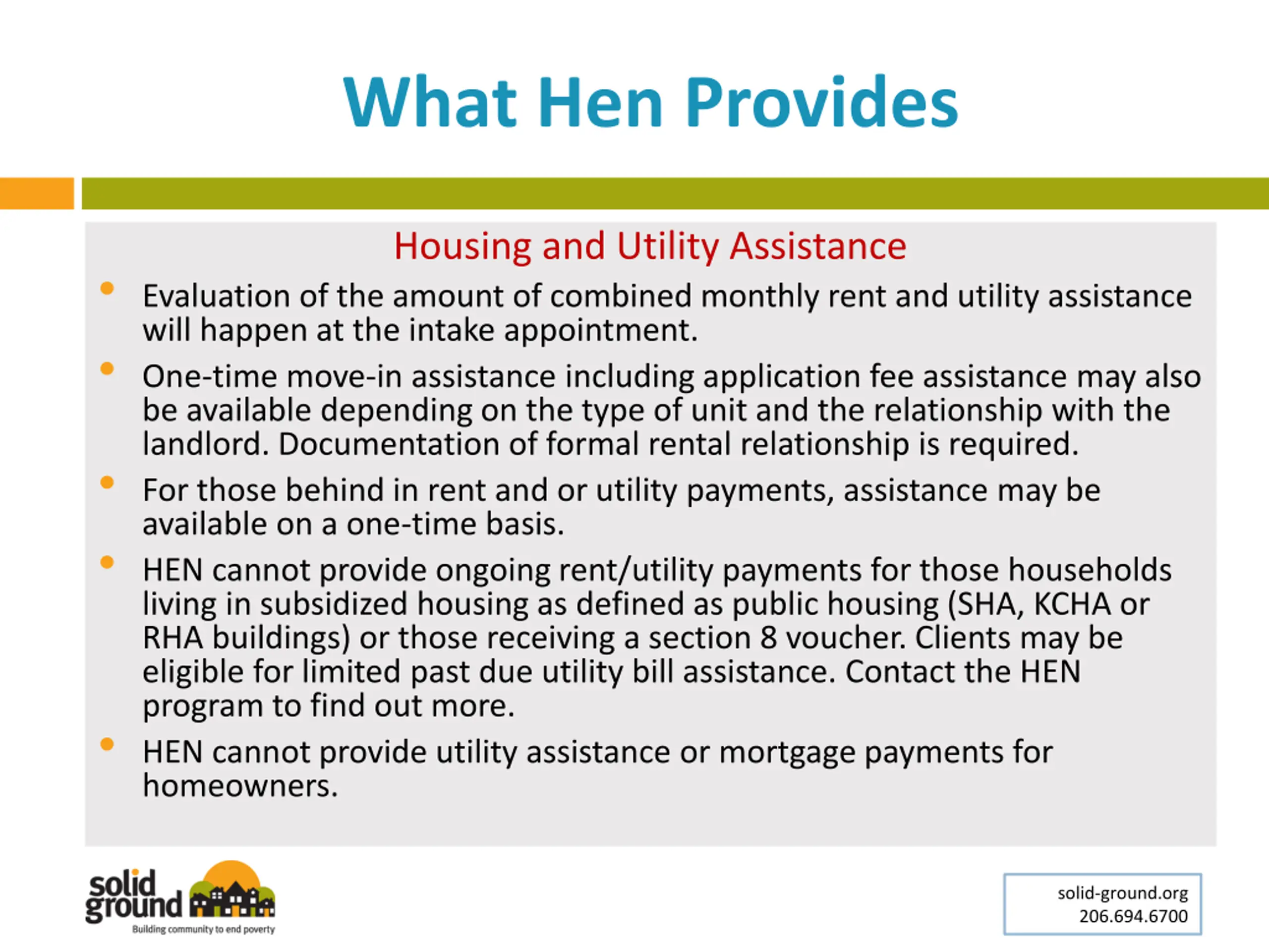 What Hen Provides Housing and Utility Assistance Evaluation of the amount of combined monthly rent and utility assistance will happen at the intake appointment. One-time move-in assistance including application fee assistance may also be available depending on the type of unit and the relationship with the landlord. Documentation of formal rental relationship is required. For those behind in rent and or utility payments, assistance may be available on a one-time basis. HEN cannot provide ongoing rent/utility payments for those households living in subsidized housing as defined as public housing (SHA, KCHA or RHA buildings) or those receiving a section 8 voucher. Clients may be eligible for limited past due utility bill assistance. Contact the HEN program to find out more. HEN cannot provide utility assistance or mortgage payments for homeowners. solid-ground.org 206.694.6700