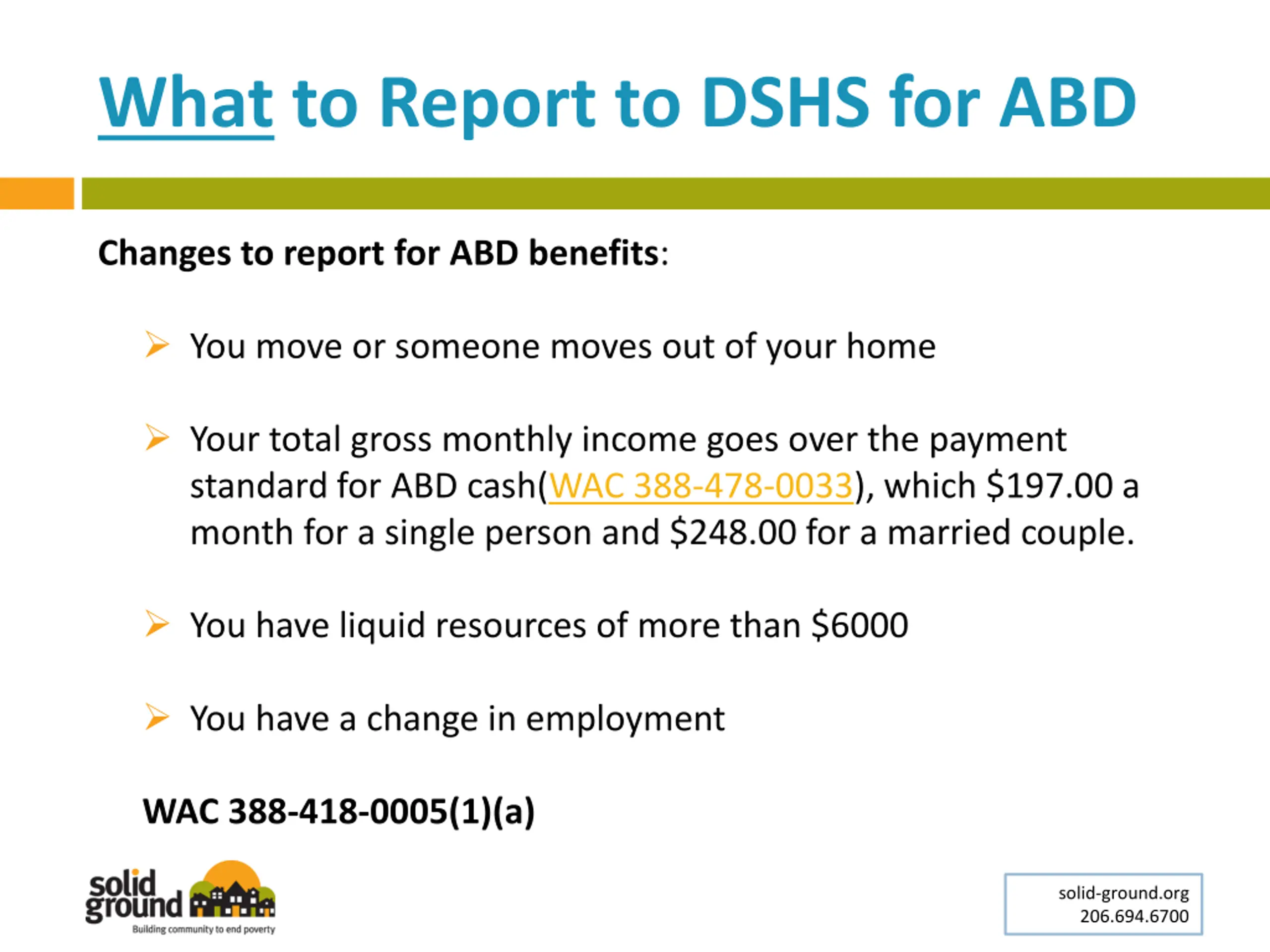 What to Report to DSHS for ABD Changes to report for ABD benefits: You move or someone moves out of your home Your total gross monthly income goes over the payment standard for ABD cash(WAC 388-478-0033), which $197.00 a month for a single person and $248.00 for a married couple. You have liquid resources of more than $6000 You have a change in employment WAC 388-418-0005(1)(a) solid-ground.org 206.694.6700