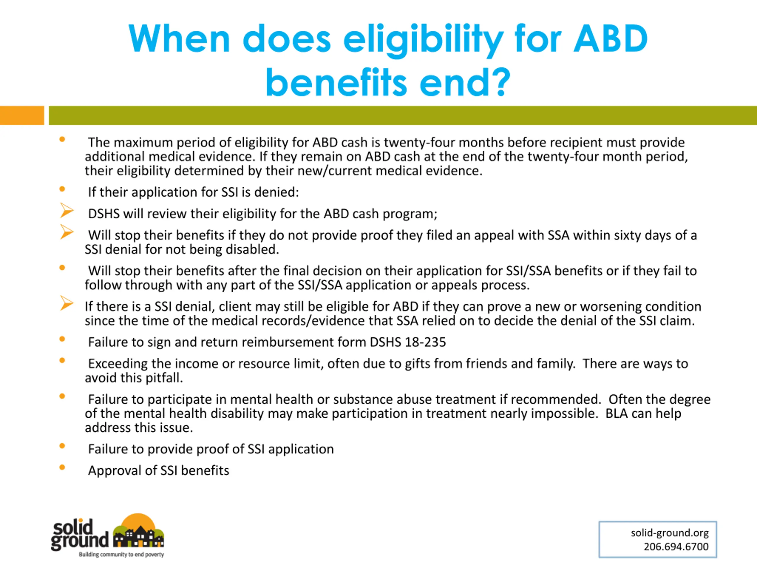 When does eligibility for ABD benefits end? The maximum period of eligibility for ABD cash is twenty-four months before recipient must provide additional medical evidence. If they remain on ABD cash at the end of the twenty-four month period, their eligibility determined by their new/current medical evidence. If their application for SSI is denied: DSHS will review their eligibility for the ABD cash program; Will stop their benefits if they do not provide proof they filed an appeal with SSA within sixty days of a SSI denial for not being disabled. Will stop their benefits after the final decision on their application for SSI/SSA benefits or if they fail to follow through with any part of the SSI/SSA application or appeals process. If there is a SSI denial, client may still be eligible for ABD if they can prove a new or worsening condition since the time of the medical records/evidence that SSA relied on to decide the denial of the SSI claim. Failure to sign and return reimbursement form DSHS 18-235 Exceeding the income or resource limit, often due to gifts from friends and family. There are ways to avoid this pitfall. Failure to participate in mental health or substance abuse treatment if recommended. Often the degree of the mental health disability may make participation in treatment nearly impossible. BLA can help address this issue. Failure to provide proof of SSI application Approval of SSI benefits solid-ground.org 206.694.6700