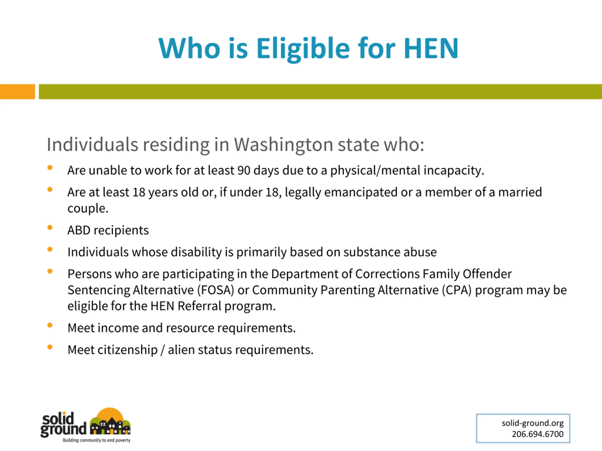 Who is Eligible for HEN Individuals residing in Washington state who: Are unable to work for at least 90 days due to a physical/mental incapacity. Are at least 18 years old or, if under 18, legally emancipated or a member of a married couple. ABD recipients Individuals whose disability is primarily based on substance abuse Persons who are participating in the Department of Corrections Family Offender Sentencing Alternative (FOSA) or Community Parenting Alternative (CPA) program may be eligible for the HEN Referral program. Meet income and resource requirements. Meet citizenship / alien status requirements. solid-ground.org 206.694.6700