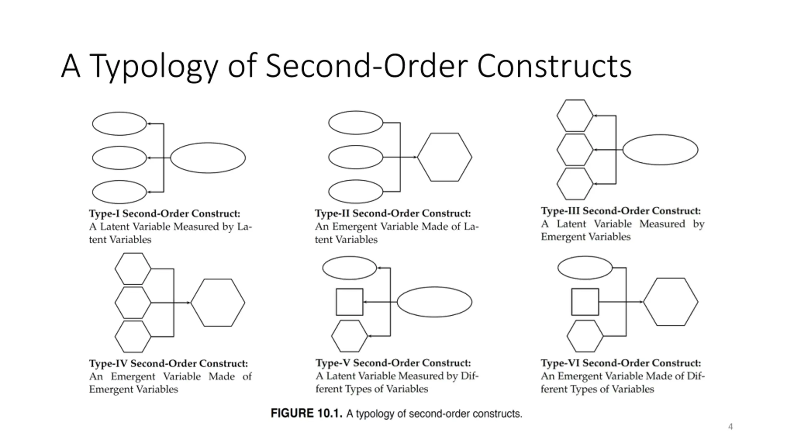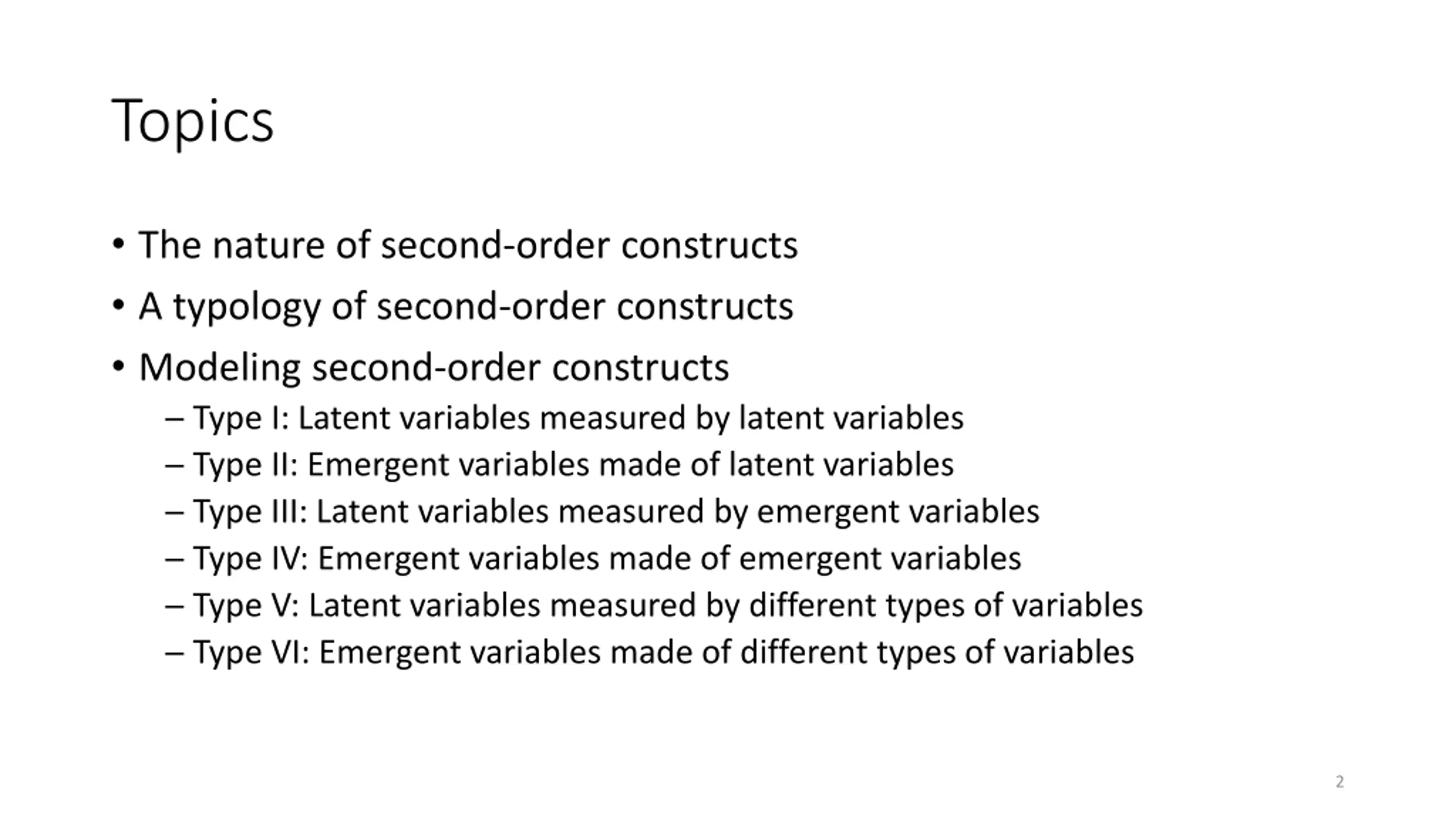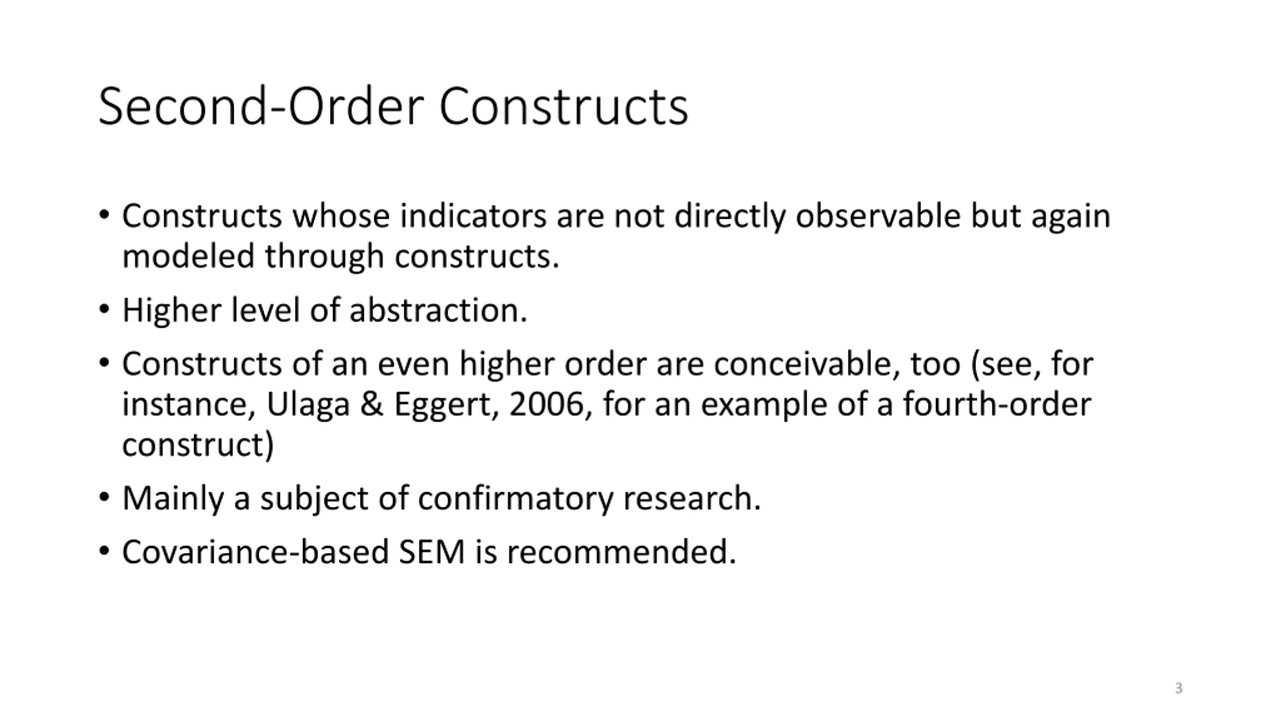 Topics The nature of second-order constructs A typology of second-order constructs Modeling second-order constructs Type I: Latent variables measured by latent variables Type II: Emergent variables made of latent variables Type III: Latent variables measured by emergent variables Type IV: Emergent variables made of emergent variables Type V: Latent variables measured by different types of variables Type VI: Emergent variables made of different types of variables 2