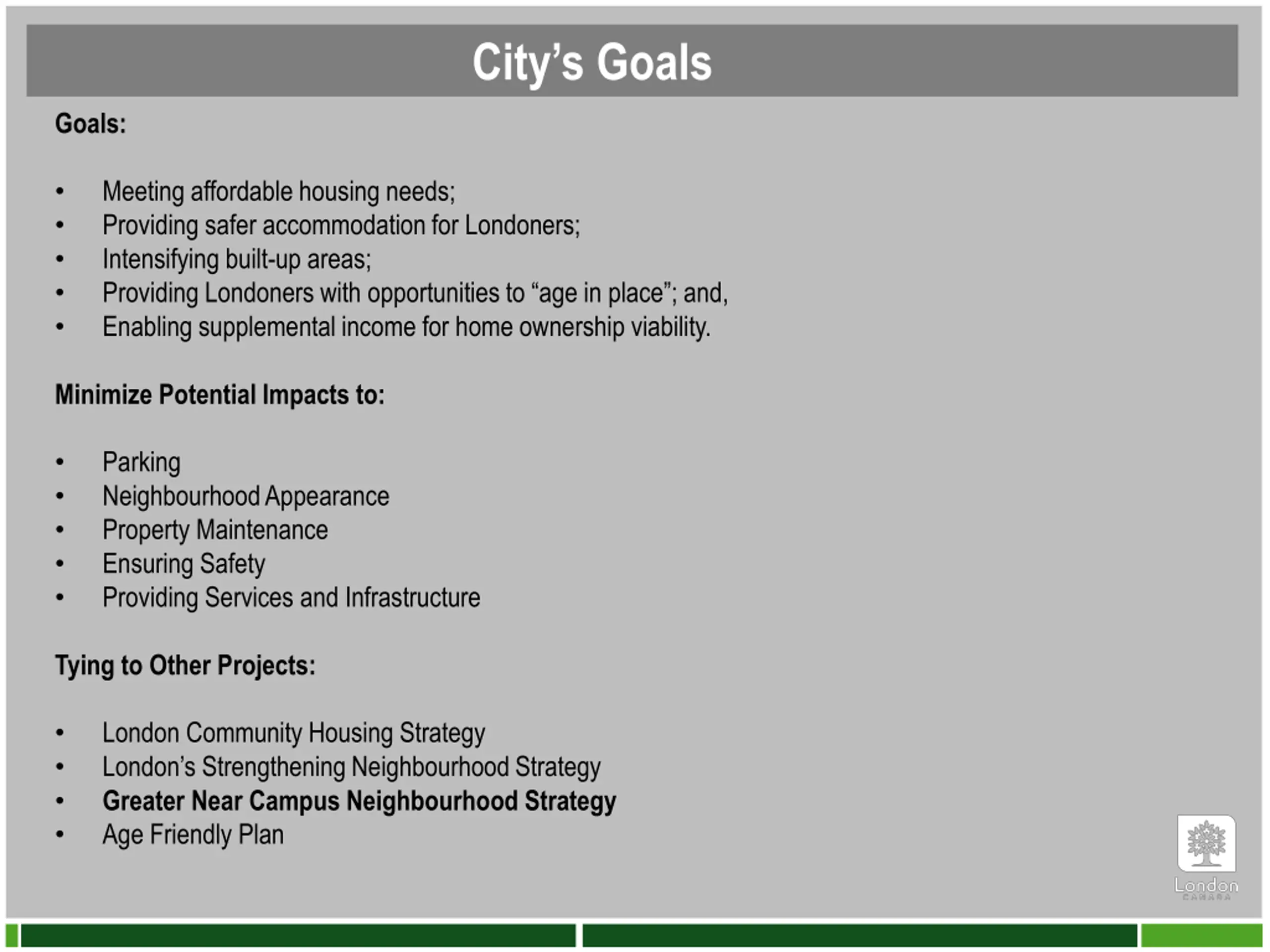 Citys Goals Goals: Meeting affordable housing needs; Providing safer accommodation for Londoners; Intensifying built-up areas; Providing Londoners with opportunities to age in place ; and, Enabling supplemental income for home ownership viability. Minimize Potential Impacts to: Parking Neighbourhood Appearance Property Maintenance Ensuring Safety Providing Services and Infrastructure Tying to Other Projects: London Community Housing Strategy London s Strengthening Neighbourhood Strategy Greater Near Campus Neighbourhood Strategy Age Friendly Plan