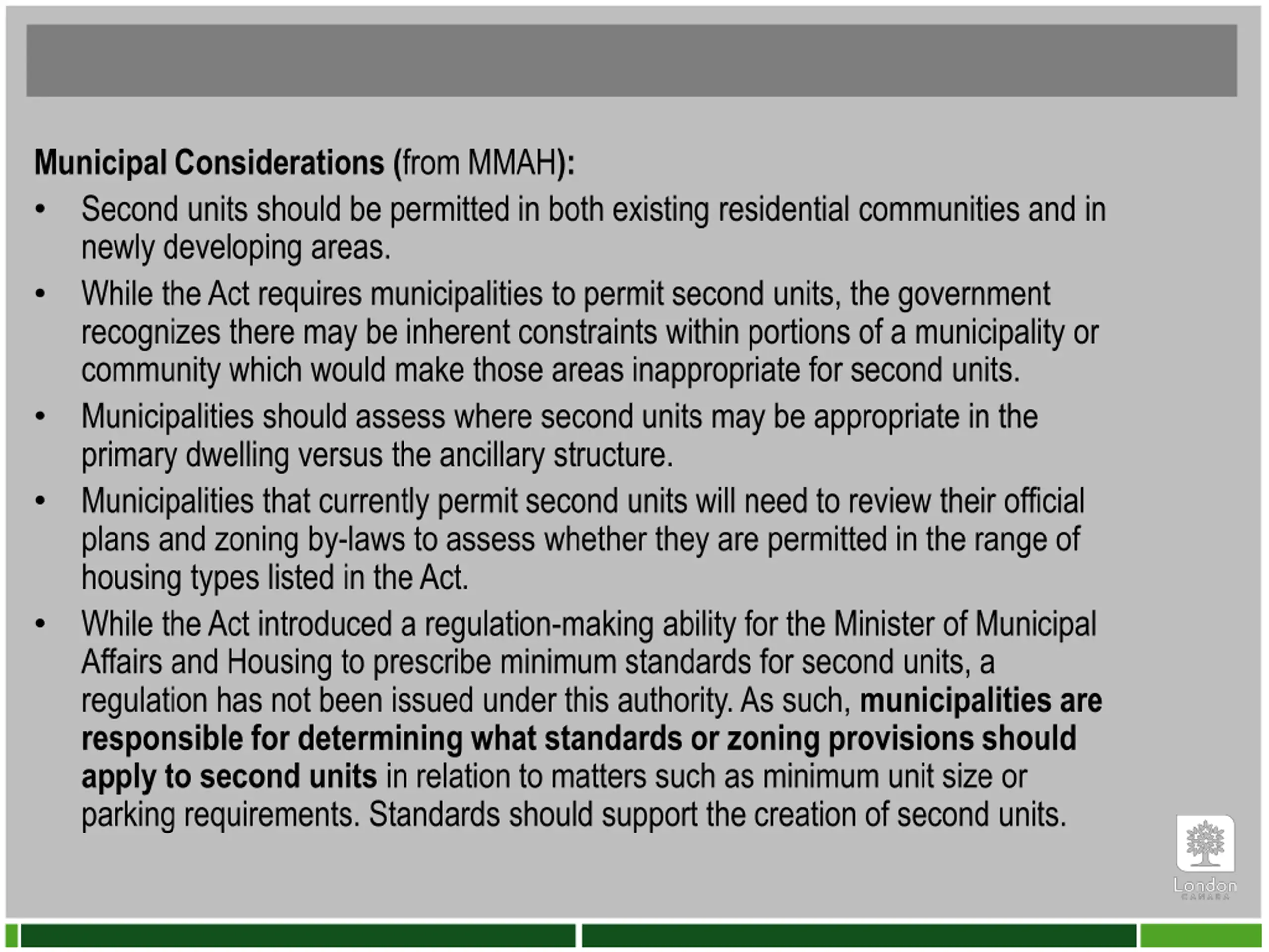 Municipal Considerations (from MMAH): Second units should be permitted in both existing residential communities and in newly developing areas. While the Act requires municipalities to permit second units, the government recognizes there may be inherent constraints within portions of a municipality or community which would make those areas inappropriate for second units. Municipalities should assess where second units may be appropriate in the primary dwelling versus the ancillary structure. Municipalities that currently permit second units will need to review their official plans and zoning by-laws to assess whether they are permitted in the range of housing types listed in the Act. While the Act introduced a regulation-making ability for the Minister of Municipal Affairs and Housing to prescribe minimum standards for second units, a regulation has not been issued under this authority. As such, municipalities are responsible for determining what standards or zoning provisions should apply to second units in relation to matters such as minimum unit size or parking requirements. Standards should support the creation of second units.