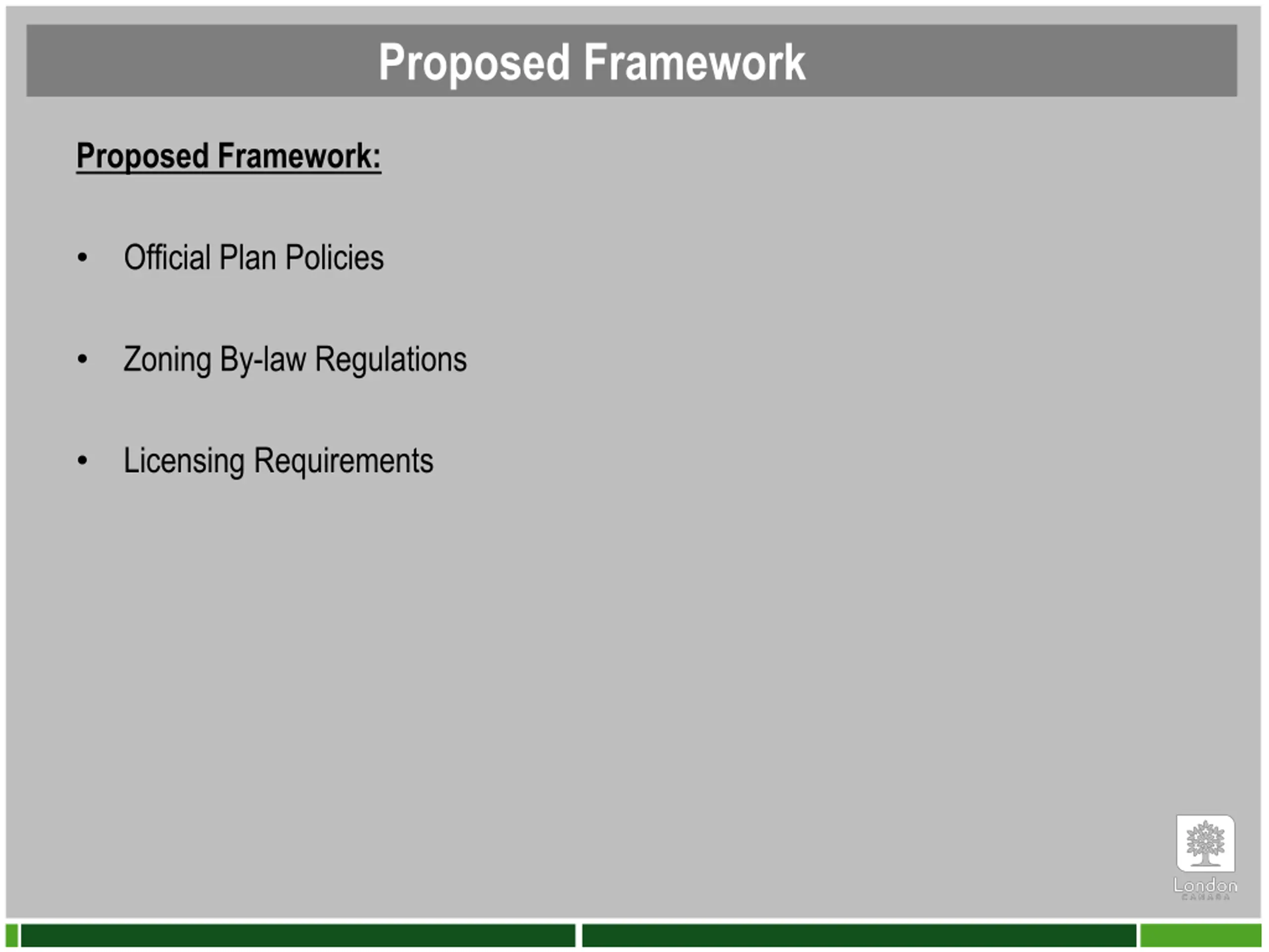 Proposed Framework Proposed Framework: Official Plan Policies Zoning By-law Regulations Licensing Requirements