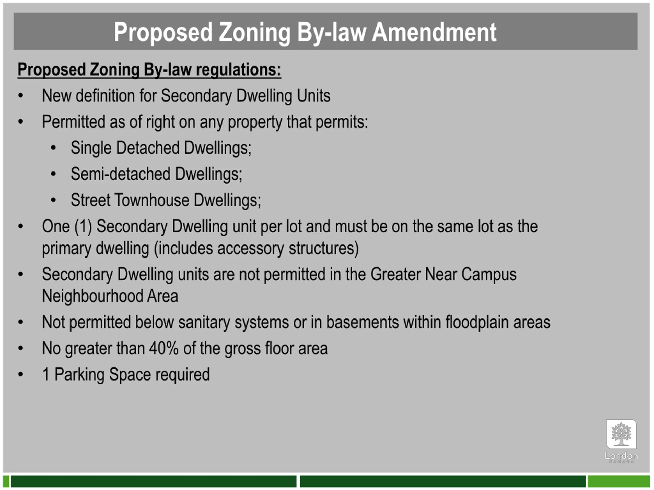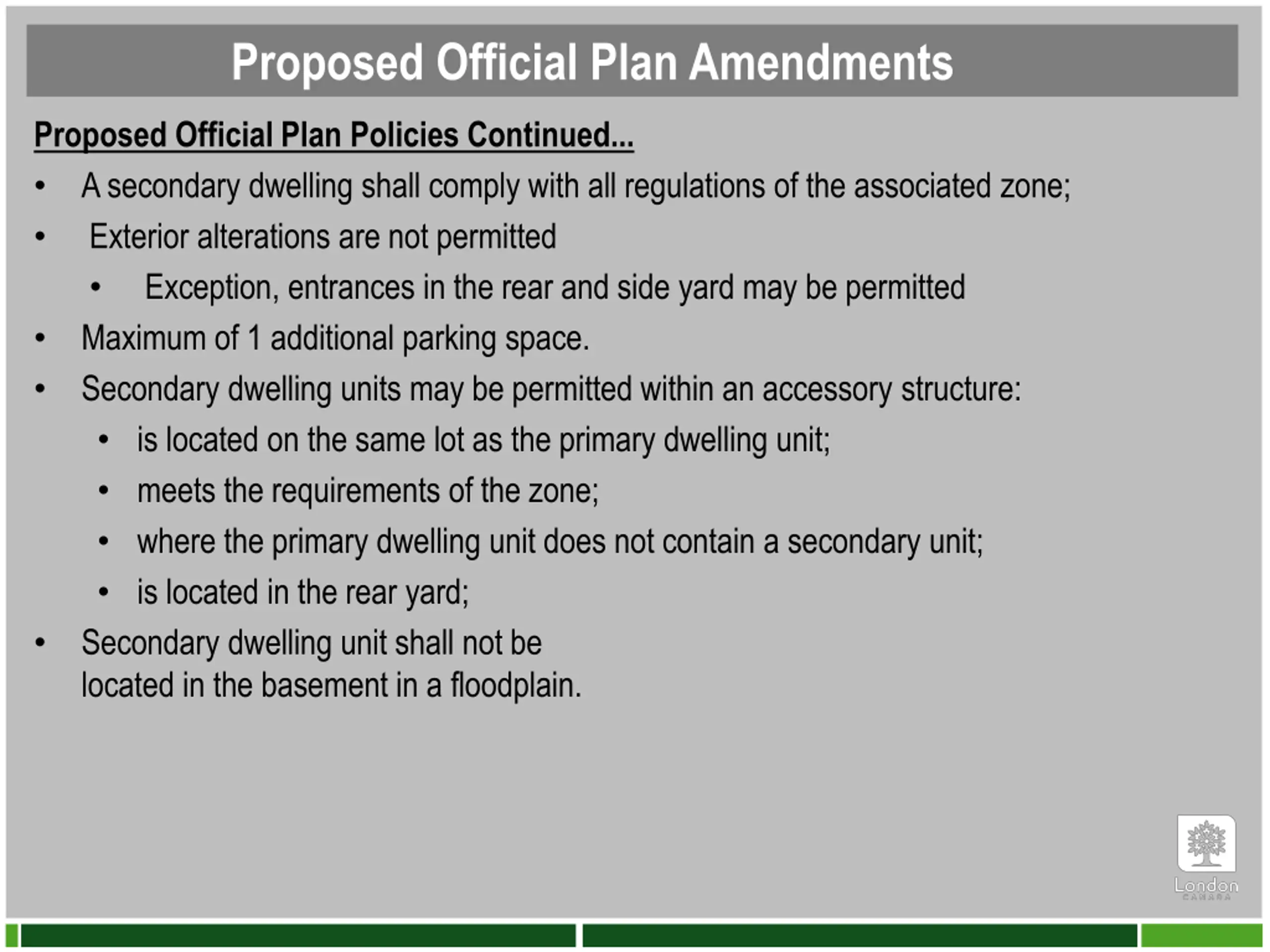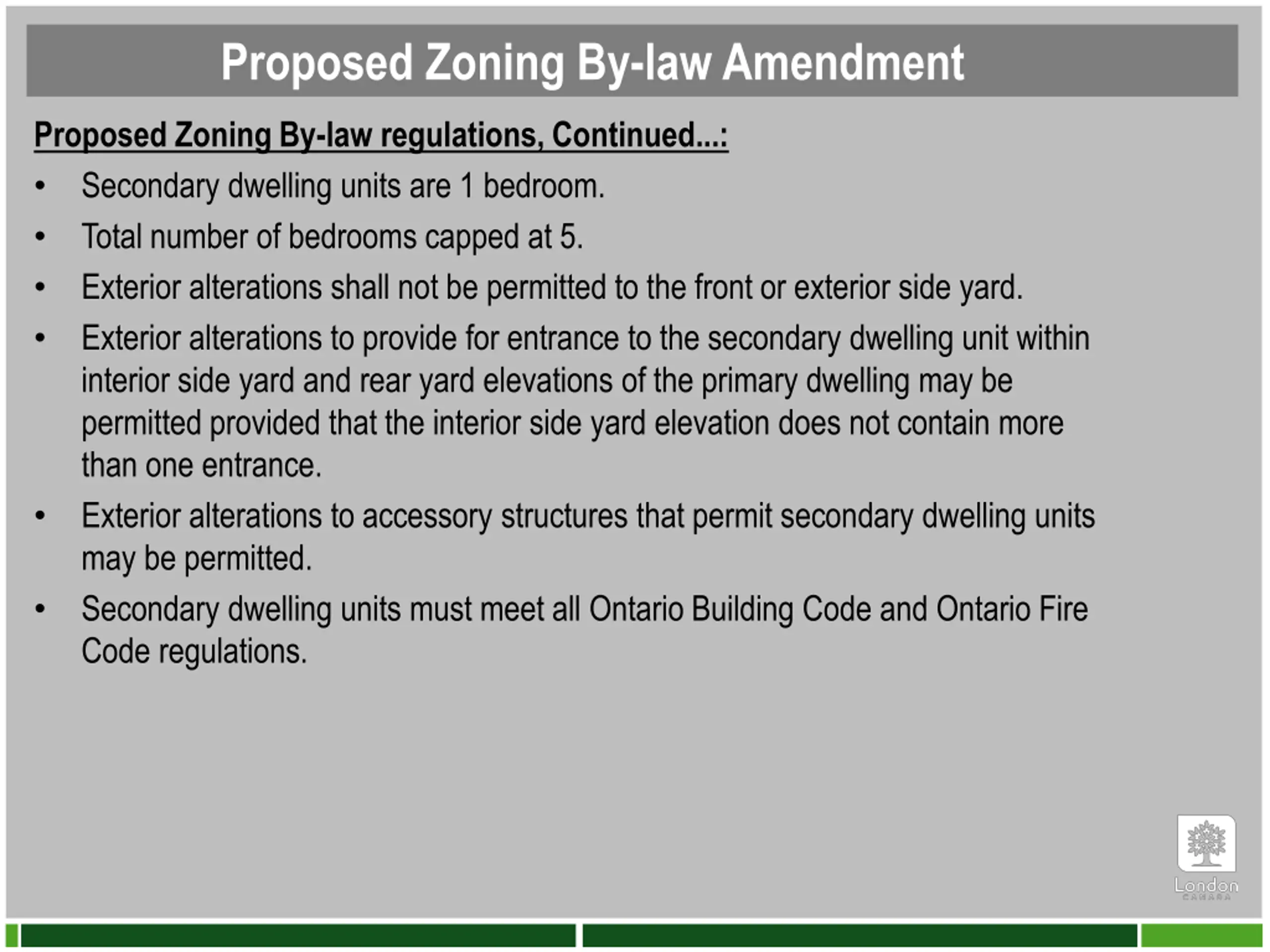 Proposed Zoning By-law Amendment Proposed Zoning By-law regulations, Continued...: Secondary dwelling units are 1 bedroom. Total number of bedrooms capped at 5. Exterior alterations shall not be permitted to the front or exterior side yard. Exterior alterations to provide for entrance to the secondary dwelling unit within interior side yard and rear yard elevations of the primary dwelling may be permitted provided that the interior side yard elevation does not contain more than one entrance. Exterior alterations to accessory structures that permit secondary dwelling units may be permitted. Secondary dwelling units must meet all Ontario Building Code and Ontario Fire Code regulations.