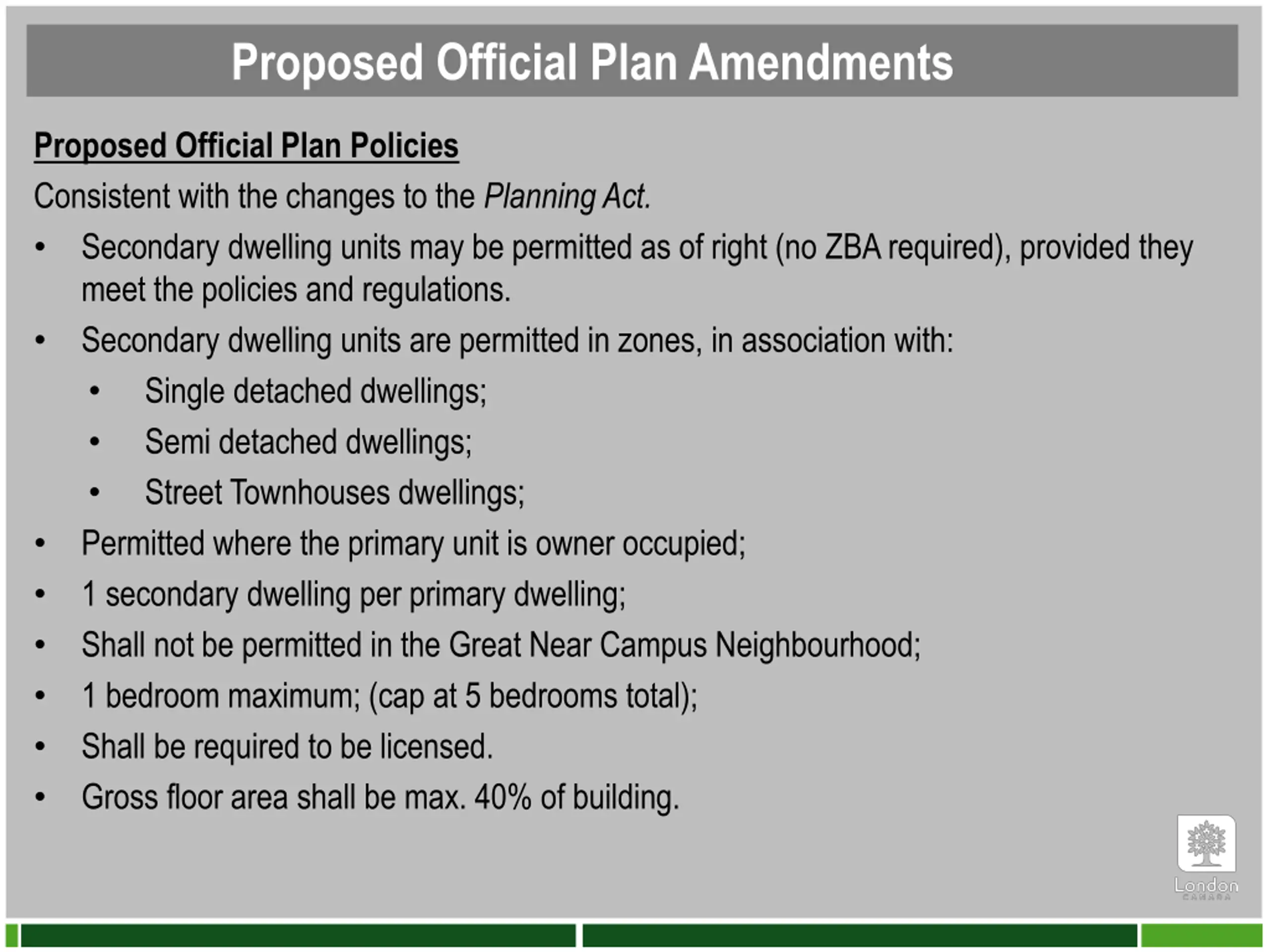 Proposed Official Plan Amendments Proposed Official Plan Policies Consistent with the changes to the Planning Act. Secondary dwelling units may be permitted as of right (no ZBArequired), provided they meet the policies and regulations. Secondary dwelling units are permitted in zones, in association with: Single detached dwellings; Semi detached dwellings; Street Townhouses dwellings; Permitted where the primary unit is owner occupied; 1 secondary dwelling per primary dwelling; Shall not be permitted in the Great Near Campus Neighbourhood; 1 bedroom maximum; (cap at 5 bedrooms total); Shall be required to be licensed. Gross floor area shall be max. 40% of building.