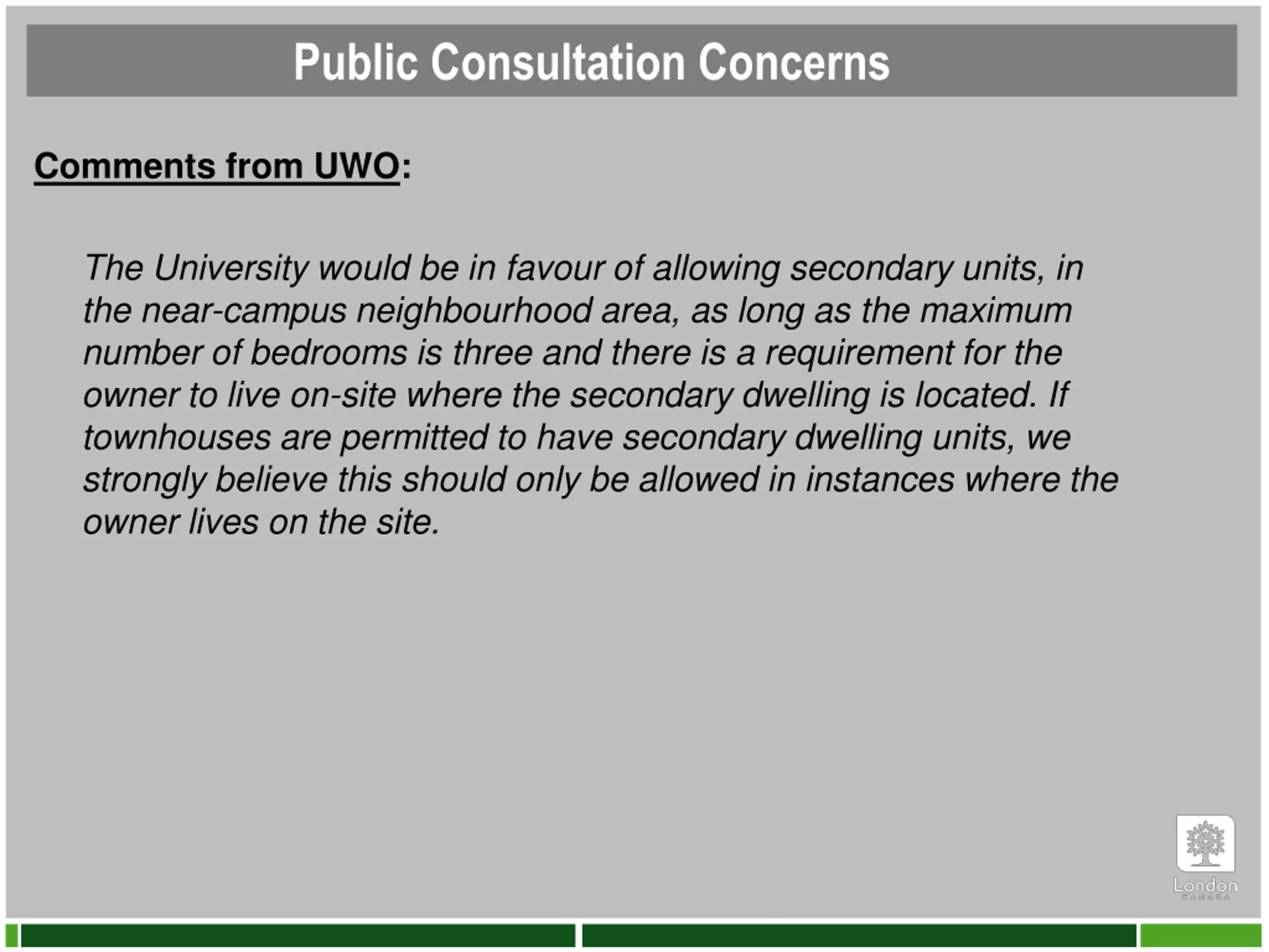 Public Consultation Concerns Comments from UWO: The University would be in favour of allowing secondary units, in the near-campus neighbourhood area, as long as the maximum number of bedrooms is three and there is a requirement for the owner to live on-site where the secondary dwelling is located. If townhouses are permitted to have secondary dwelling units, we strongly believe this should only be allowed in instances where the owner lives on the site.
