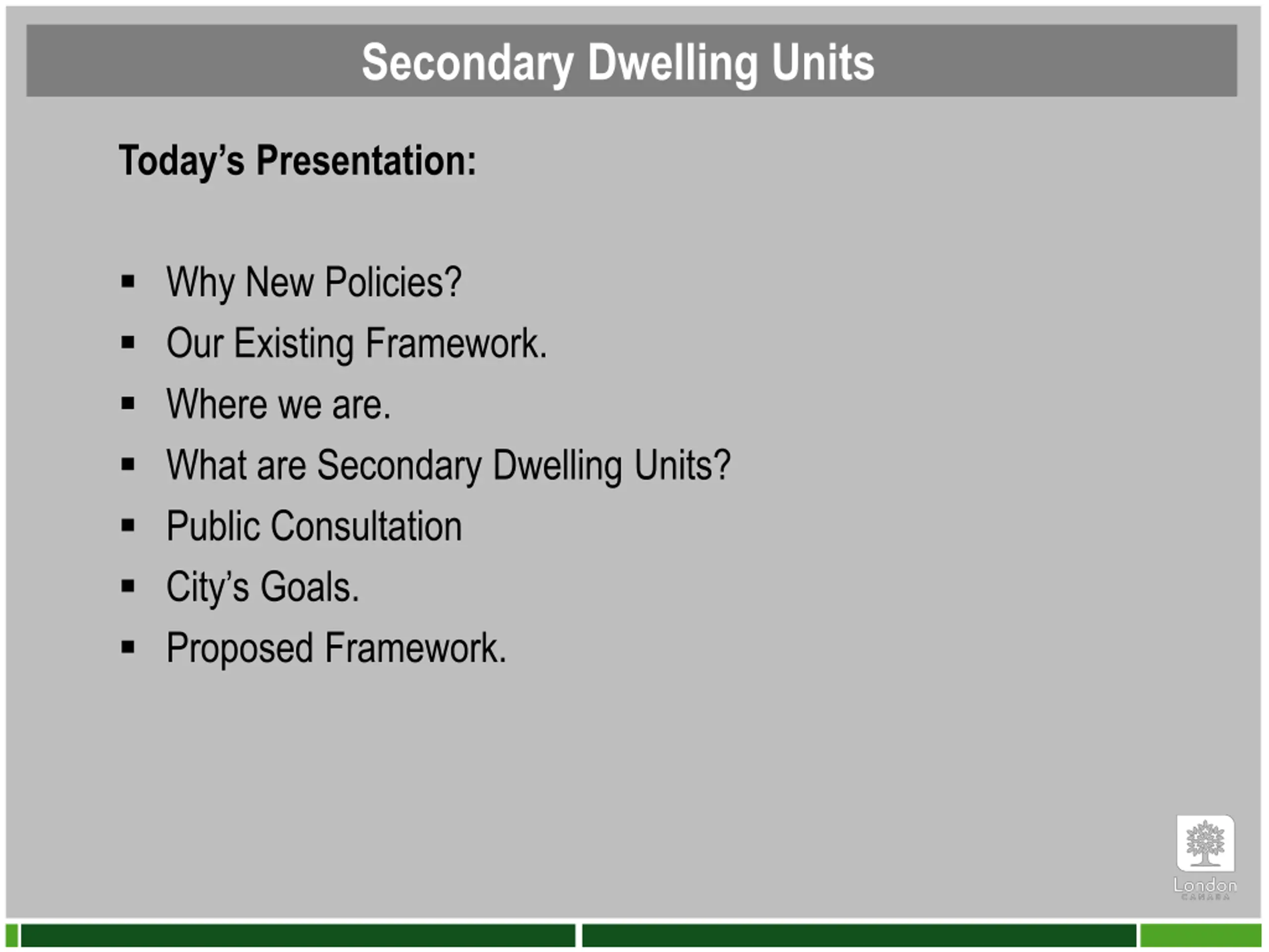 Secondary Dwelling Units Today s Presentation: Why New Policies? Our Existing Framework. Where we are. What are Secondary Dwelling Units? Public Consultation City s Goals. Proposed Framework.