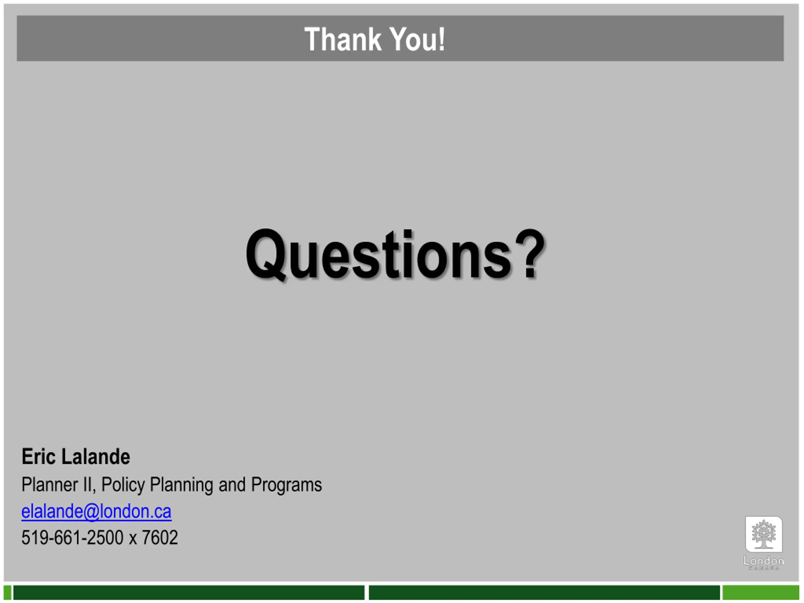Thank You! Questions? Eric Lalande Planner II, Policy Planning and Programs elalande@london.ca 519-661-2500 x 7602