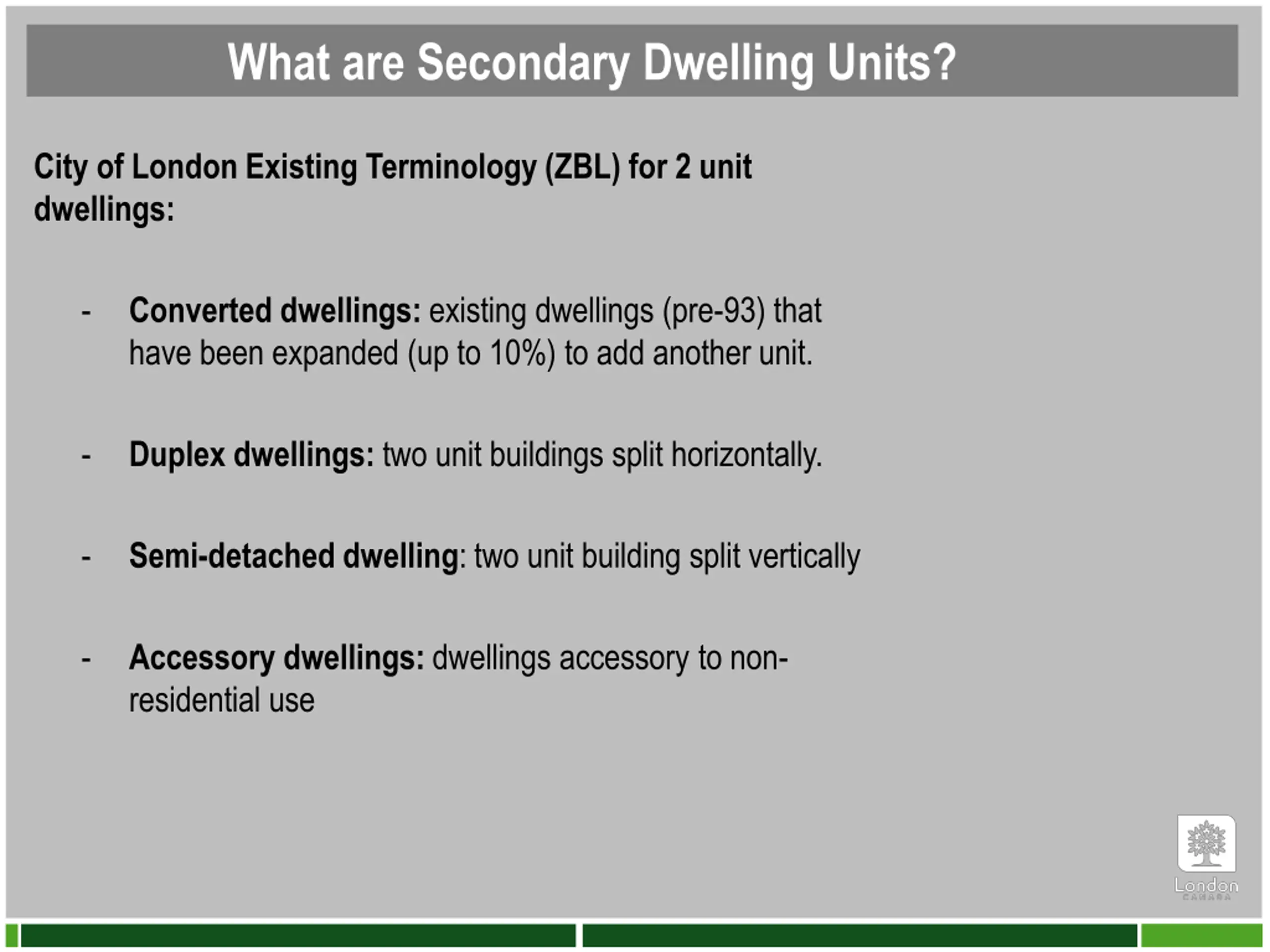 What are Secondary Dwelling Units? City of London Existing Terminology (ZBL) for 2 unit dwellings: - Converted dwellings: existing dwellings (pre-93) that have been expanded (up to 10%) to add another unit. - Duplex dwellings: two unit buildings split horizontally. - Semi-detached dwelling: two unit building split vertically - Accessory dwellings: dwellings accessory to non- residential use