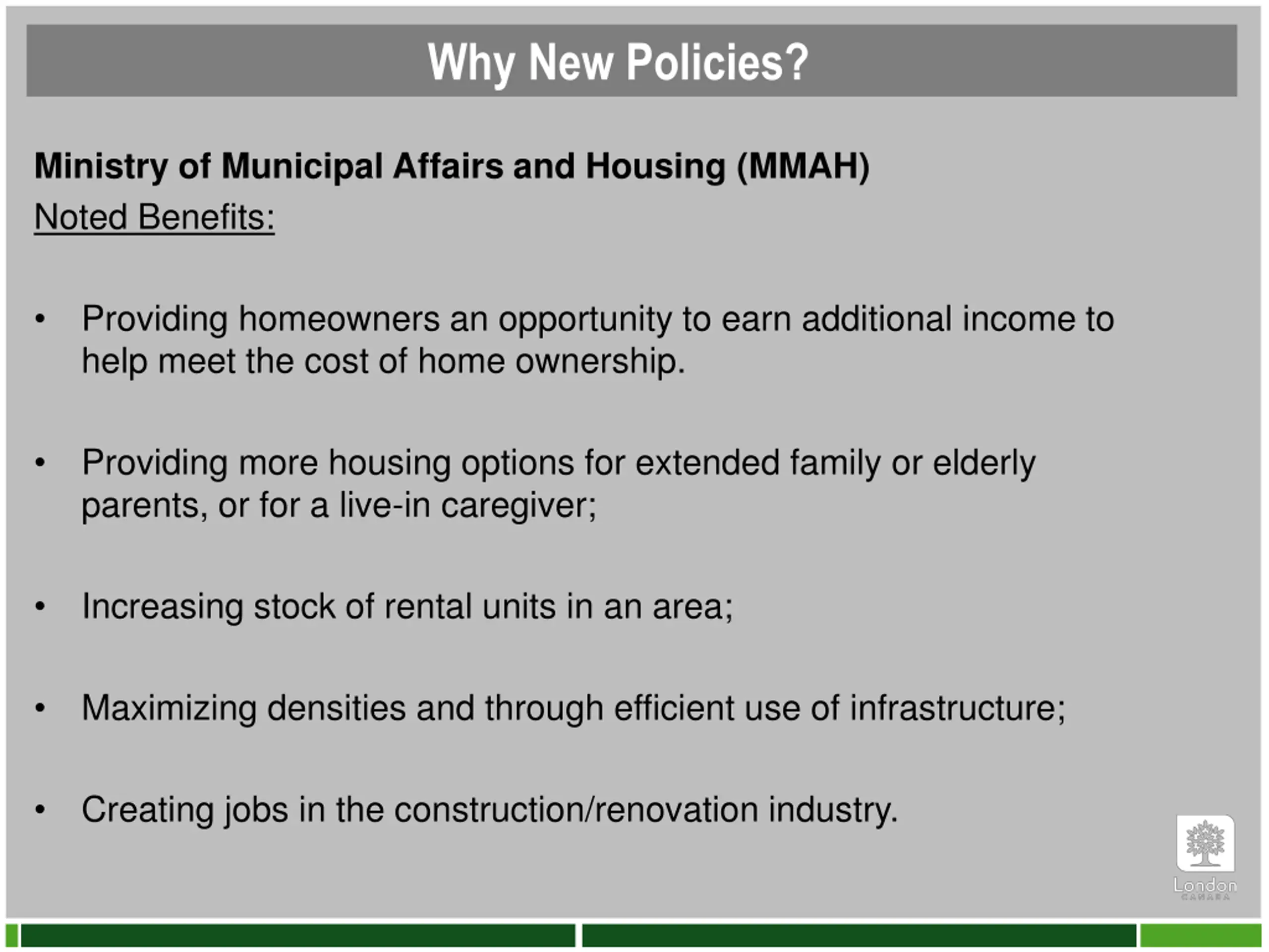 Why New Policies? Ministry of Municipal Affairs and Housing (MMAH) Noted Benefits: Providing homeowners an opportunity to earn additional income to help meet the cost of home ownership. Providing more housing options for extended family or elderly parents, or for a live-in caregiver; Increasing stock of rental units in an area; Maximizing densities and through efficient use of infrastructure; Creating jobs in the construction/renovation industry.