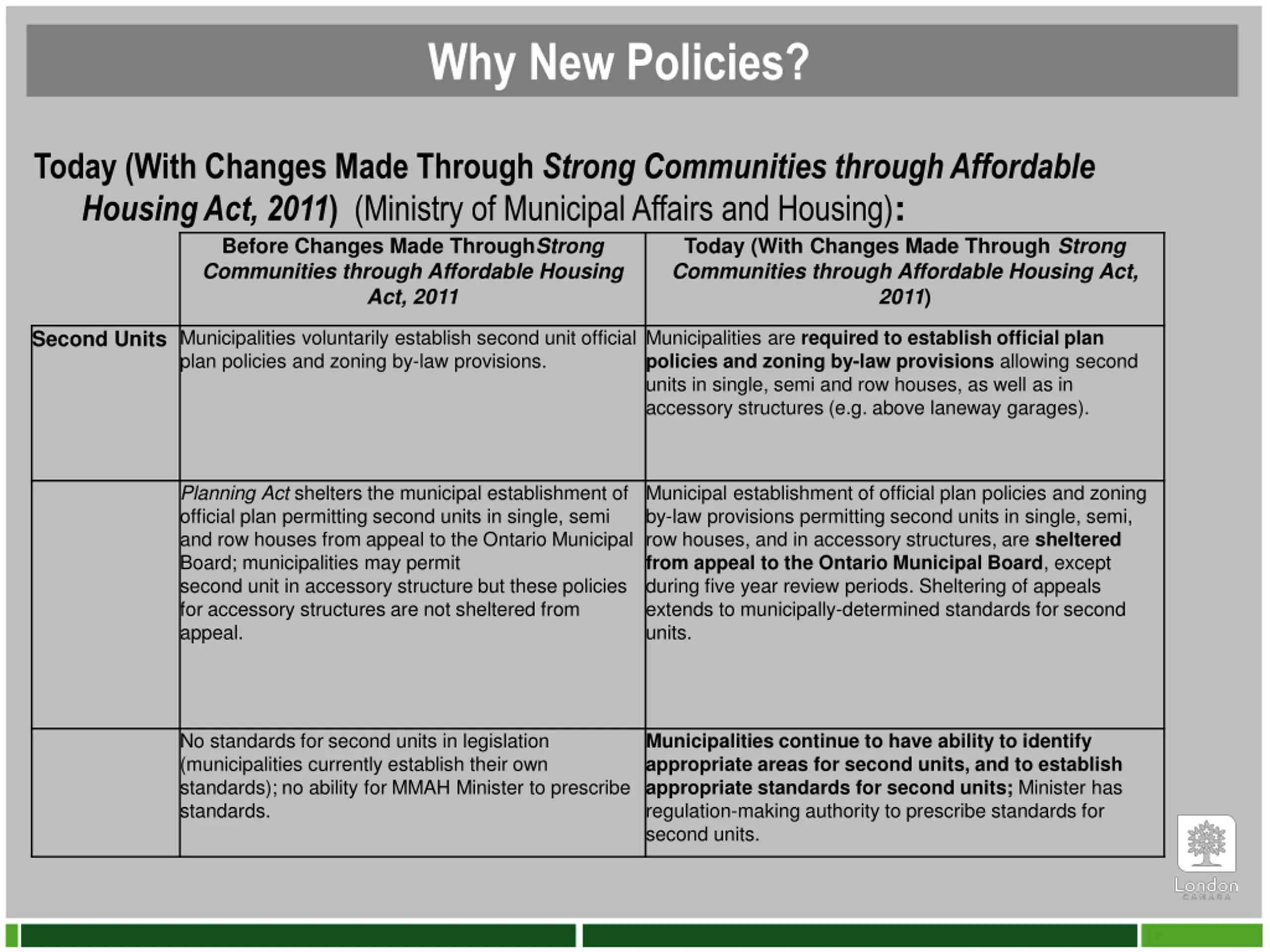 Why New Policies? Today (With Changes Made Through Strong Communities through Affordable Housing Act, 2011) (Ministry of Municipal Affairs and Housing): Before Changes Made ThroughStrong Communities through Affordable Housing Act, 2011 Today (With Changes Made Through Strong Communities through Affordable Housing Act, 2011) Second Units Municipalities voluntarily establish second unit official plan policies and zoning by-law provisions. Municipalities are required to establish official plan policies and zoning by-law provisions allowing second units in single, semi and row houses, as well as in accessory structures (e.g. above laneway garages). Planning Act shelters the municipal establishment of official plan permitting second units in single, semi and row houses from appeal to the Ontario Municipal Board; municipalities may permit second unit in accessory structure but these policies for accessory structures are not sheltered from appeal. Municipal establishment of official plan policies and zoning by-law provisions permitting second units in single, semi, row houses, and in accessory structures, are sheltered from appeal to the Ontario Municipal Board, except during five year review periods. Sheltering of appeals extends to municipally-determined standards for second units. No standards for second units in legislation (municipalities currently establish their own standards); no ability for MMAH Minister to prescribe standards. Municipalities continue to have ability to identify appropriate areas for second units, and to establish appropriate standards for second units; Minister has regulation-making authority to prescribe standards for second units.