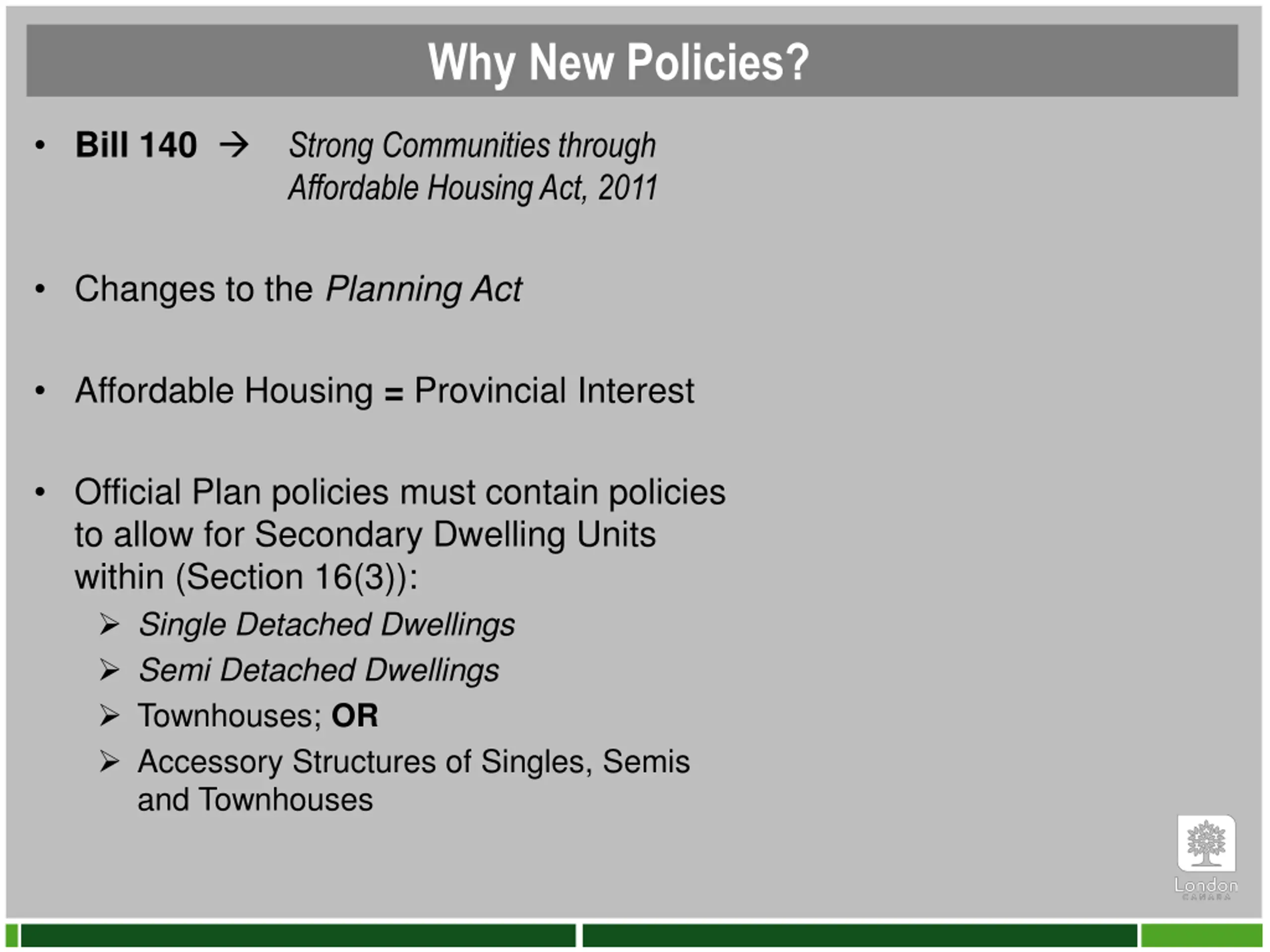 Why New Policies? Bill 140 Strong Communities through Affordable Housing Act, 2011 Changes to the Planning Act Affordable Housing = Provincial Interest Official Plan policies must contain policies to allow for Secondary Dwelling Units within (Section 16(3)): Single Detached Dwellings Semi Detached Dwellings Townhouses; OR Accessory Structures of Singles, Semis and Townhouses