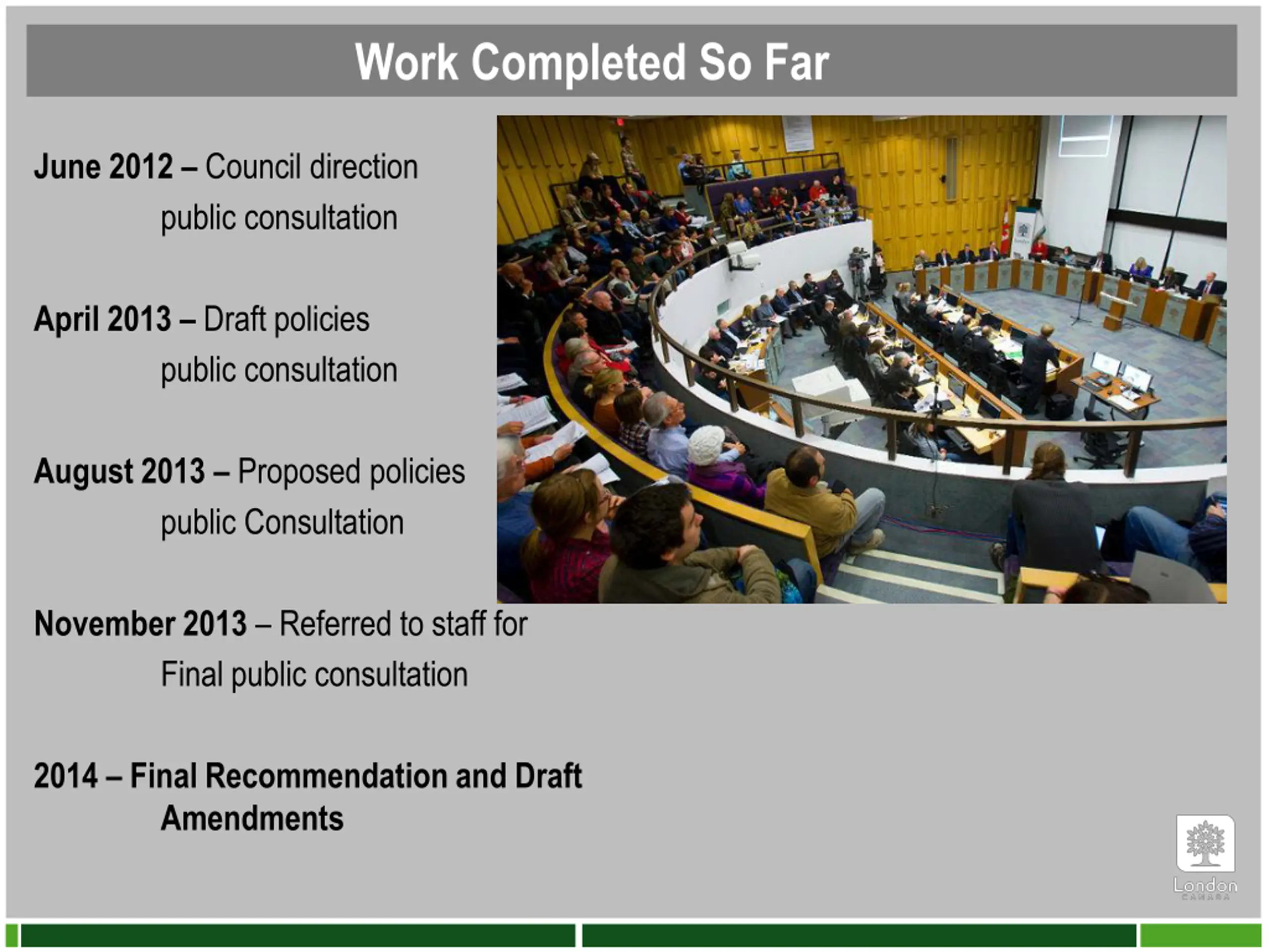 Work Completed So Far June 2012 Council direction public consultation April 2013 Draft policies public consultation August 2013 Proposed policies public Consultation November 2013 Referred to staff for Final public consultation 2014 Final Recommendation and Draft Amendments