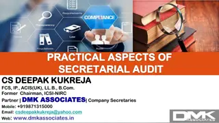 Affluence Advisory Pvt. Ltd. Secretarial Audit compliance under Companies Act, 2013 Introduction: Secretarial Audit is a compliance audit and it is a part of total compliance management in an organization. The Secretarial Audit is an effective tool for corporate compliance management. It helps to detect non-compliance and to take corrective measures. Secretarial Audit is a process to check compliance with the provisions of various laws and rules/regulations/procedures, maintenance of books, records, etc., by an independent professional to ensure that the company has complied with the legal and procedural requirements and followed the due process. It helps to accomplish the organization s objectives by bringing a systematic, disciplined approach to evaluate and improve effectiveness of risk management, control, and governance processes. Need of Secretarial Audit: Effective mechanism to ensure that the legal and procedural requirements are duly complied. Provides a level of confidence to the Directors and Key Managerial Personnel etc. Directors can concentrate on important business matters as Secretarial Audit ensures legal and procedural requirements. Strengthen the image and goodwill of a company in the minds of regulators and stakeholders. Secretarial Audit is an effective governance and compliance risk management tool. Before enactment of Companies Act, 2013, Secretarial Audit was not mandatory for the Companies. Section 204 of Companies Act, 2013 has made Secretarial Audit mandatory for Certain Companies. In Companies Act, 2013 requirement of Compliance Certificate has been withdrawn and a new and wider Concept of Secretarial Audit Report has been inserted in Section 204 of the said act. Applicability: Section 204 of the Companies Act, 2013 read with Rule 9 of the Companies (Appointment and Remuneration of Managerial Personnel) Rules, 2014, provides that- Following class of Companies shall annex with its Board s Report made in terms of Section 134, a Secretarial Audit Report, given by a Company Secretary in practice, in form MR-3. 1. 2. Every listed company Every public company having a paid-up share capital of 50 crore rupees or more; CS Abdul Shaikh | Affluence Advisory Pvt. Ltd. | Website - www.affluence.net.in |Email - connect@affluence.net.in